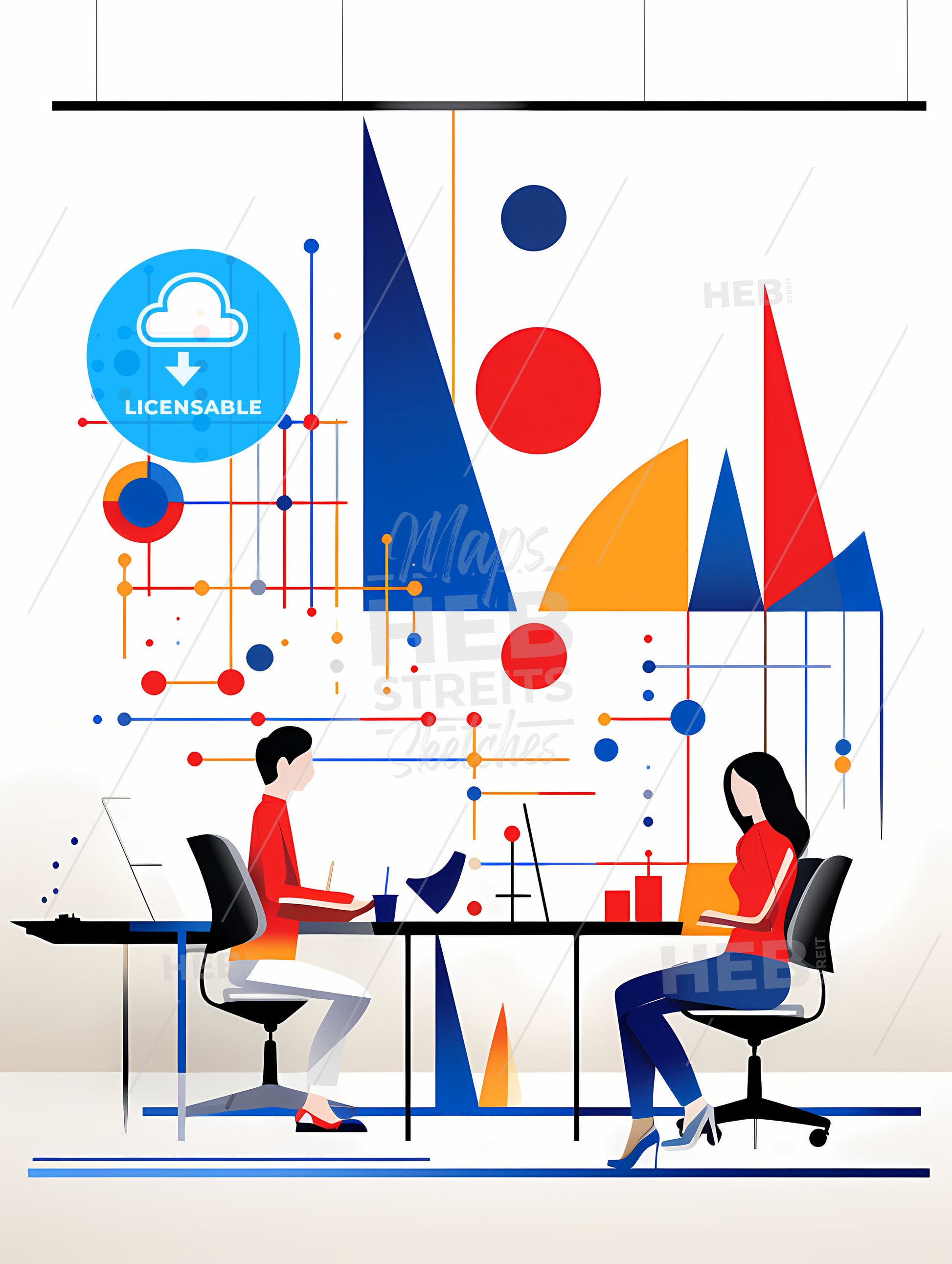 Minimalist Office Art, A Man And Woman Sitting At A Table With Laptops. Stock Illustration generated with help of high resolution generative AI. License available for private and commercial use.