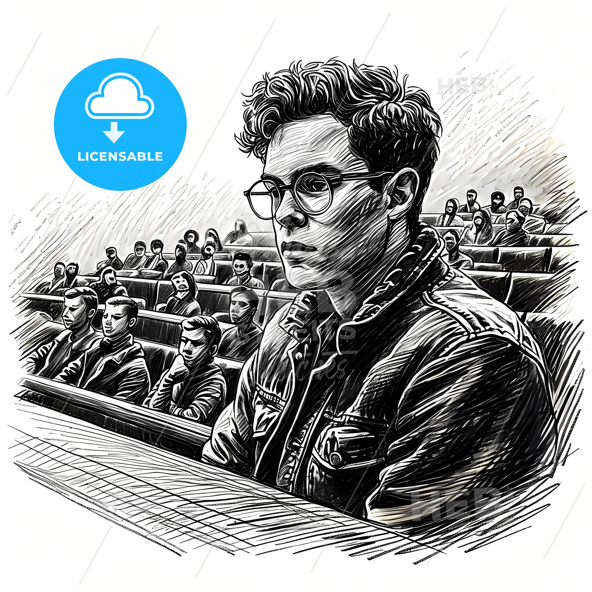 Lecture Room With Sitting Students, A Man Sitting In A Row Of People. Stock Illustration generated with help of high resolution generative AI. License available for private and commercial use.