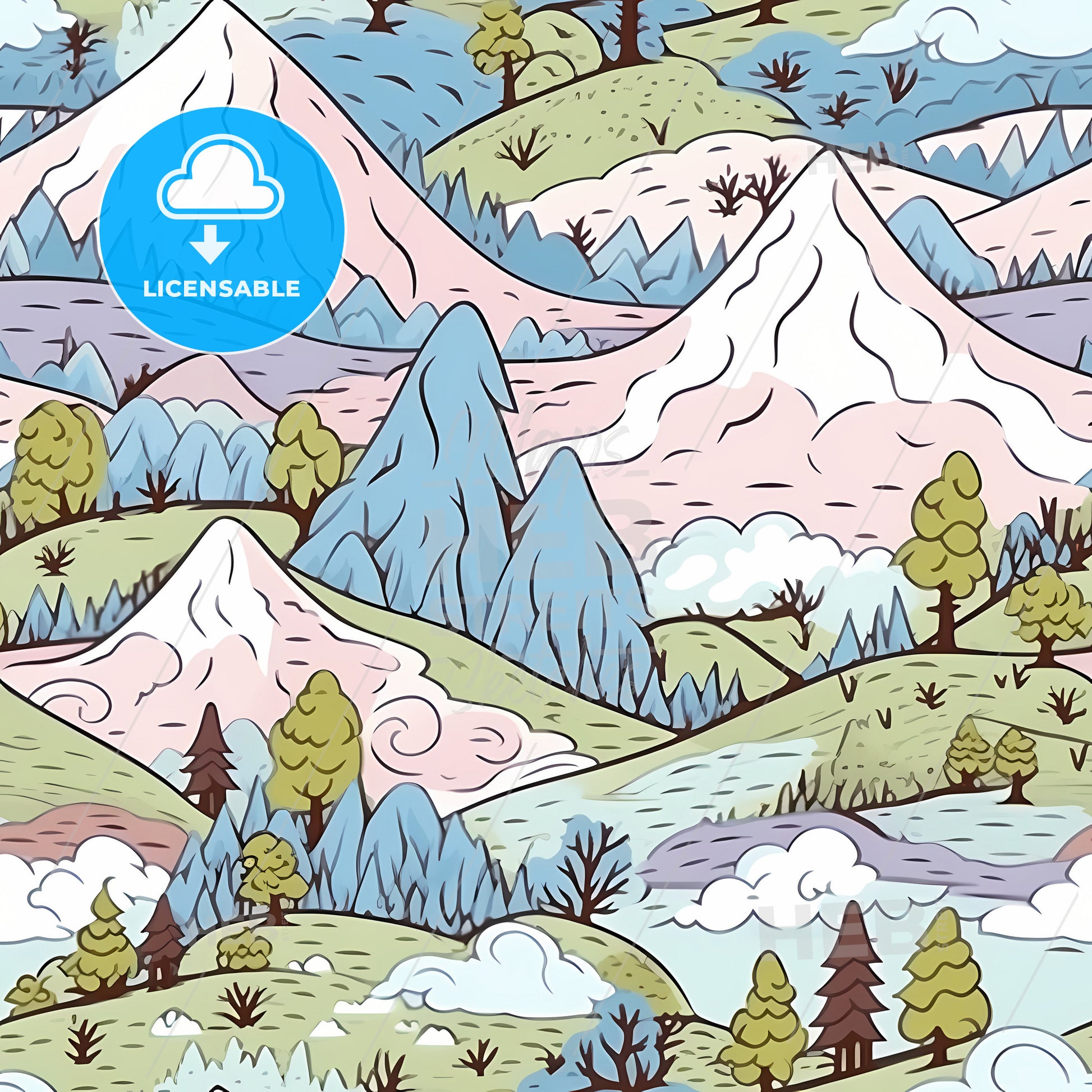 Hand Drawn Landscape Pattern, A Colorful Landscape With Mountains And Trees. Stock Illustration generated with help of high resolution generative AI. License available for private and commercial use.