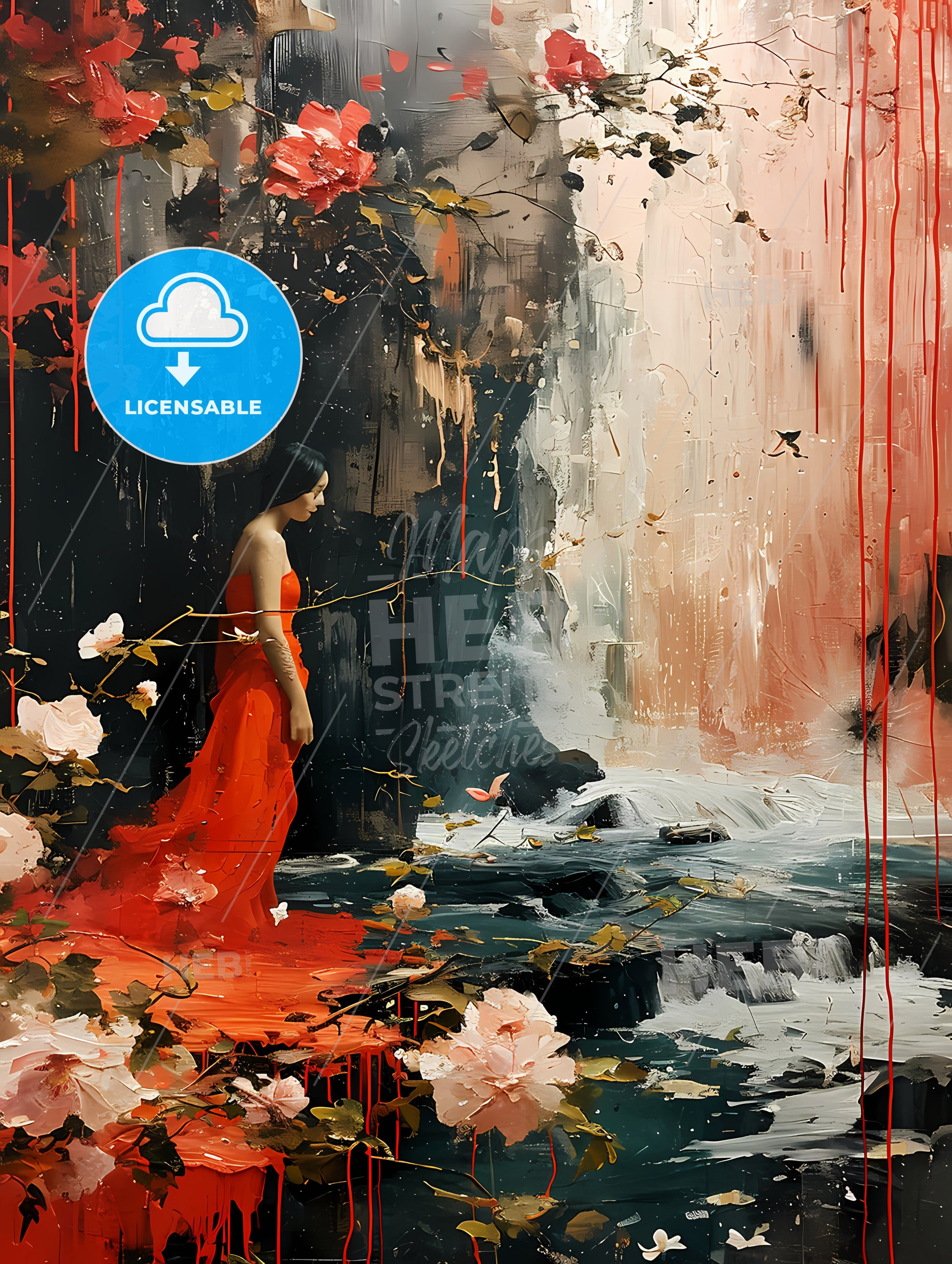 Gold Prospector Miner, A Woman In A Red Dress. Stock Illustration generated with help of high resolution generative AI. License available for private and commercial use.