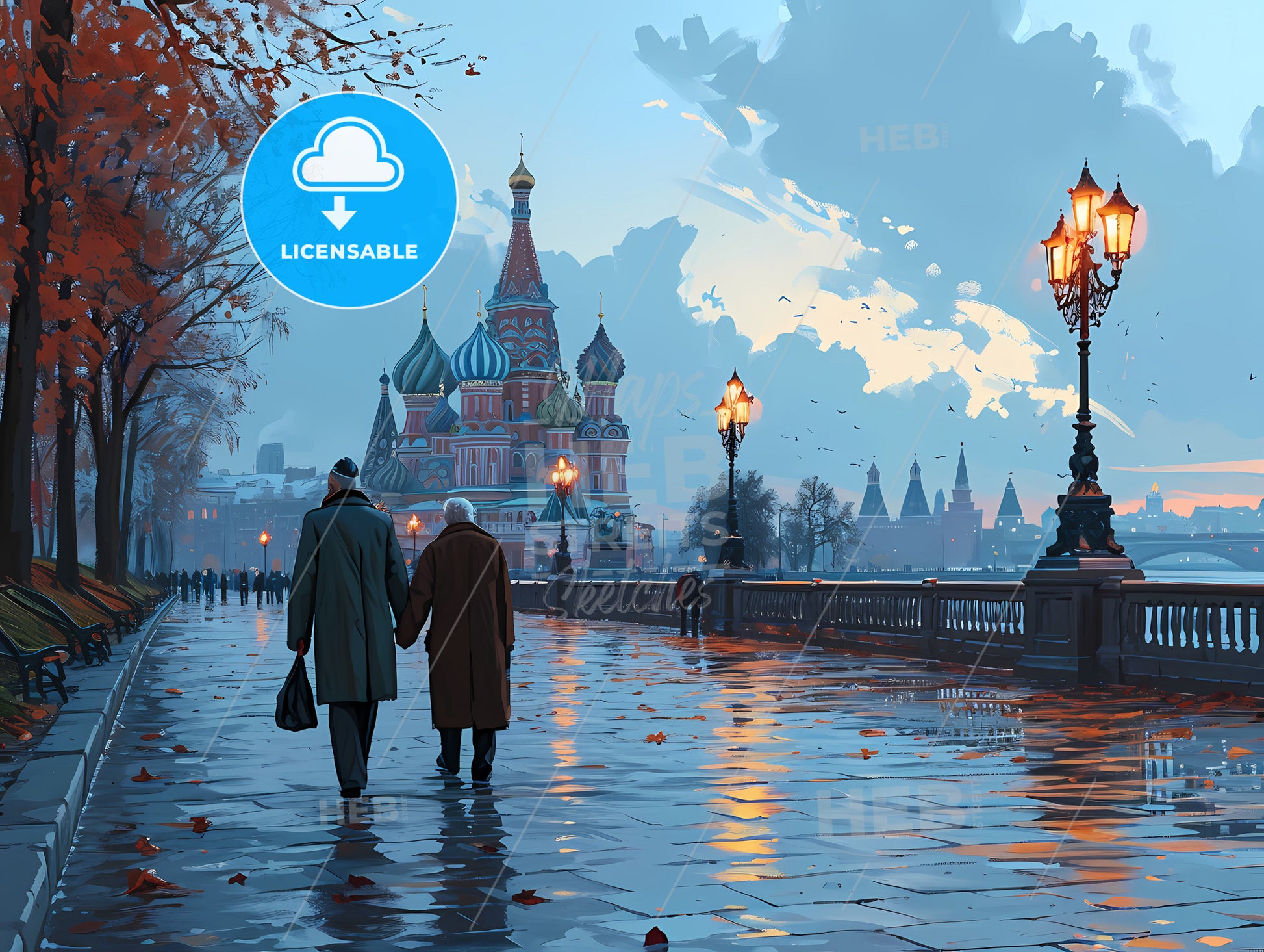Tshirt Design Minimalist, A Couple Of People Walking On A Wet Street. Stock Illustration generated with help of high resolution generative AI. License available for private and commercial use.