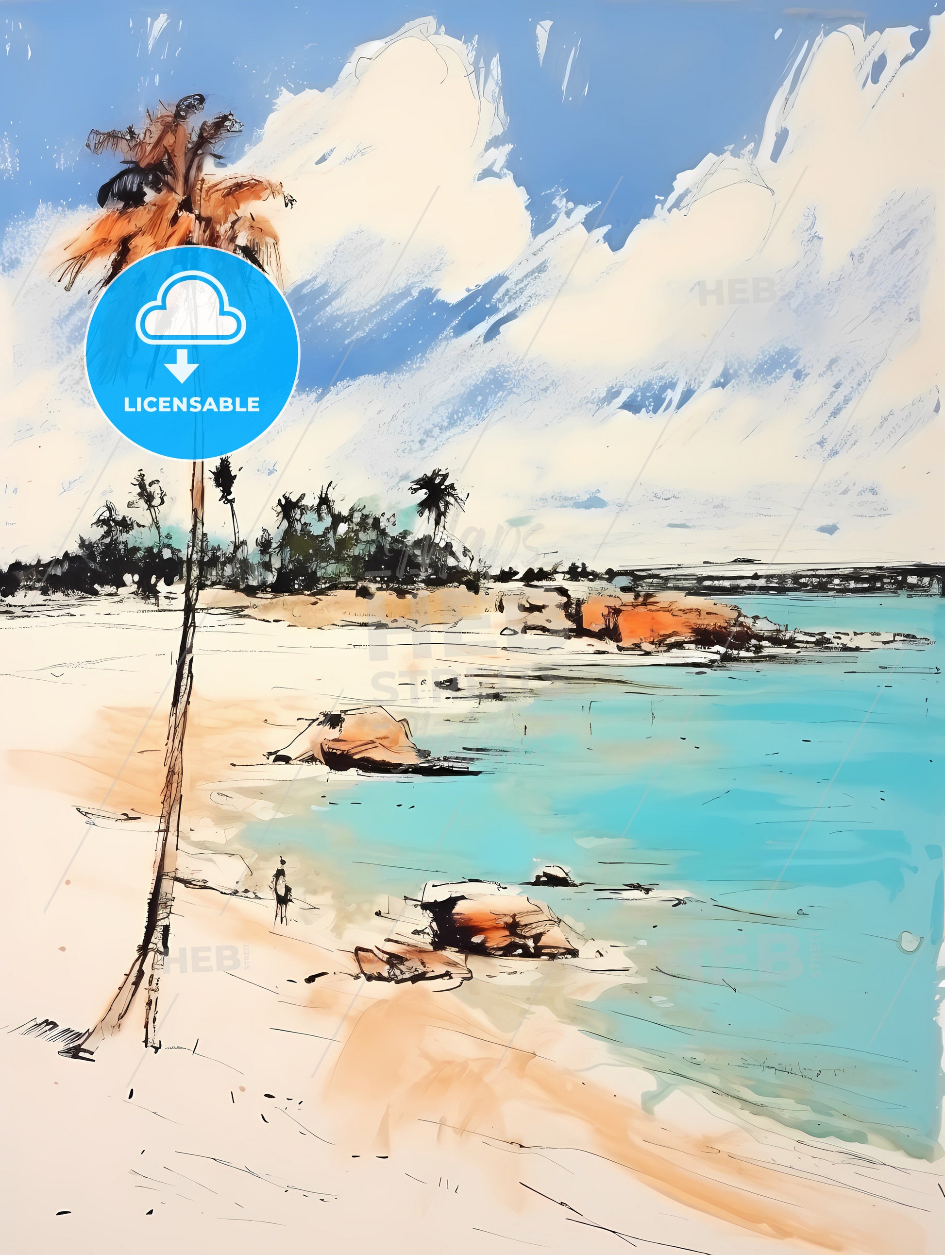 Desert Tropical Beach With Palm Tree, A Painting Of A Beach With Palm Trees And Blue Water. Stock Illustration generated with help of high resolution generative AI. License available for private and commercial use.