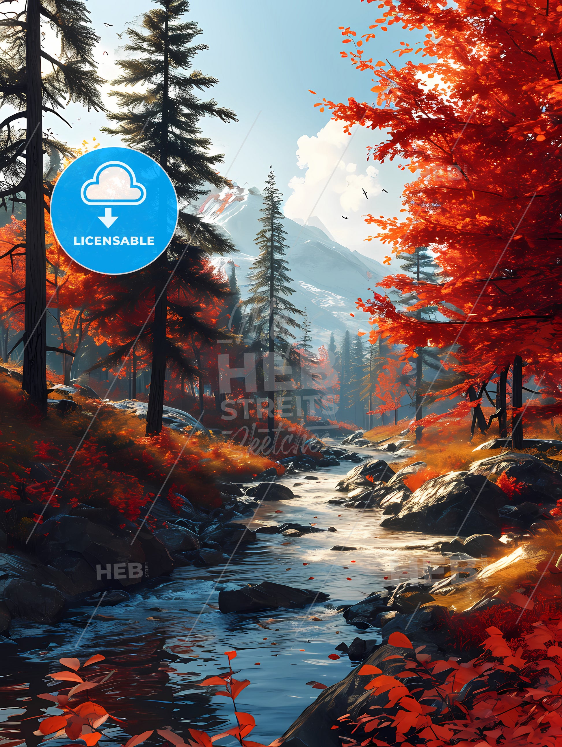 Traveling National Parks Around The World, A Stream Running Through A Forest. Stock Illustration generated with help of high resolution generative AI. License available for private and commercial use.