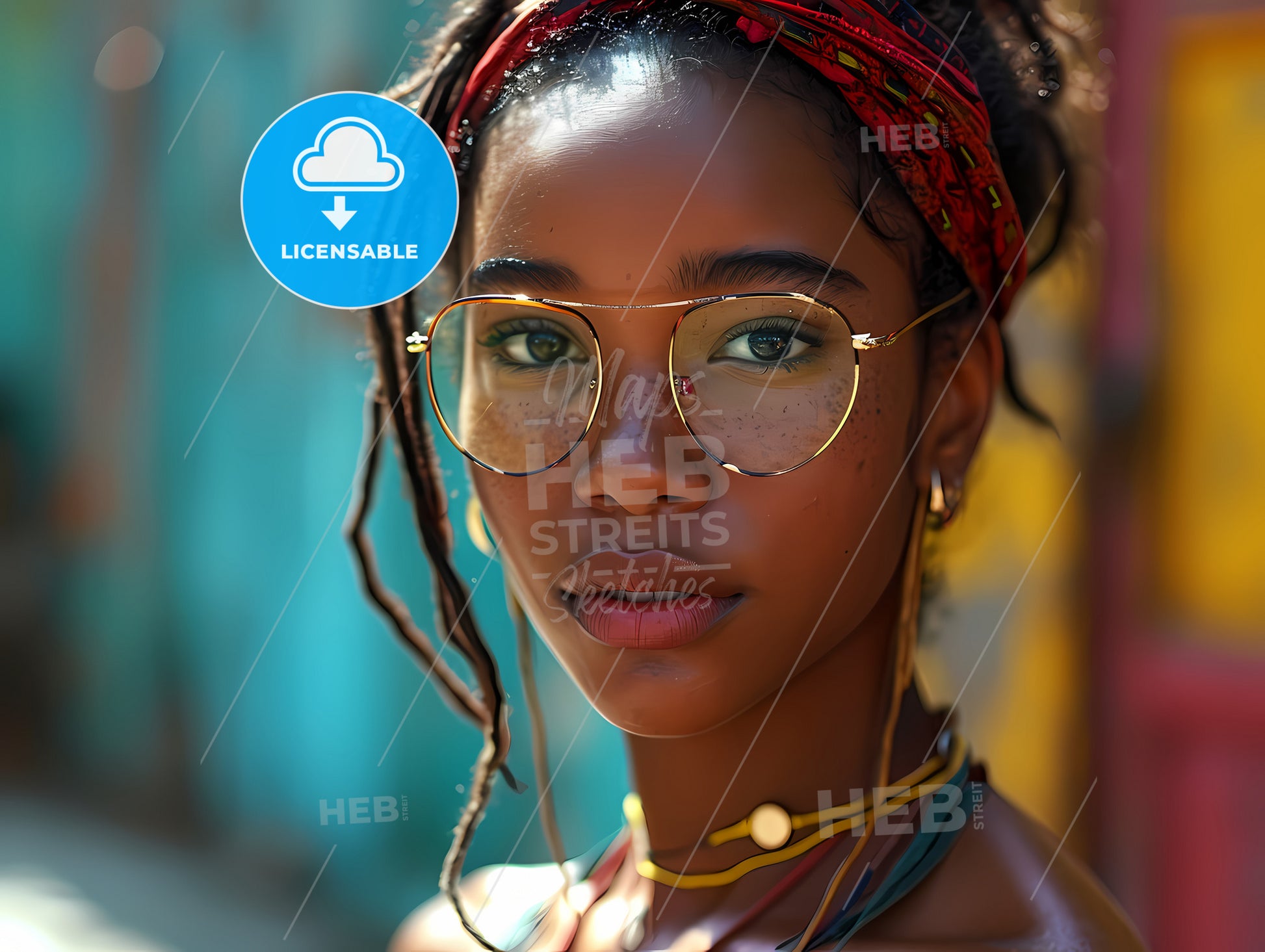 Cute Grateful-Dead Festival Girl, A Woman With Glasses And A Red Headband. Stock Illustration generated with help of high resolution generative AI. License available for private and commercial use.