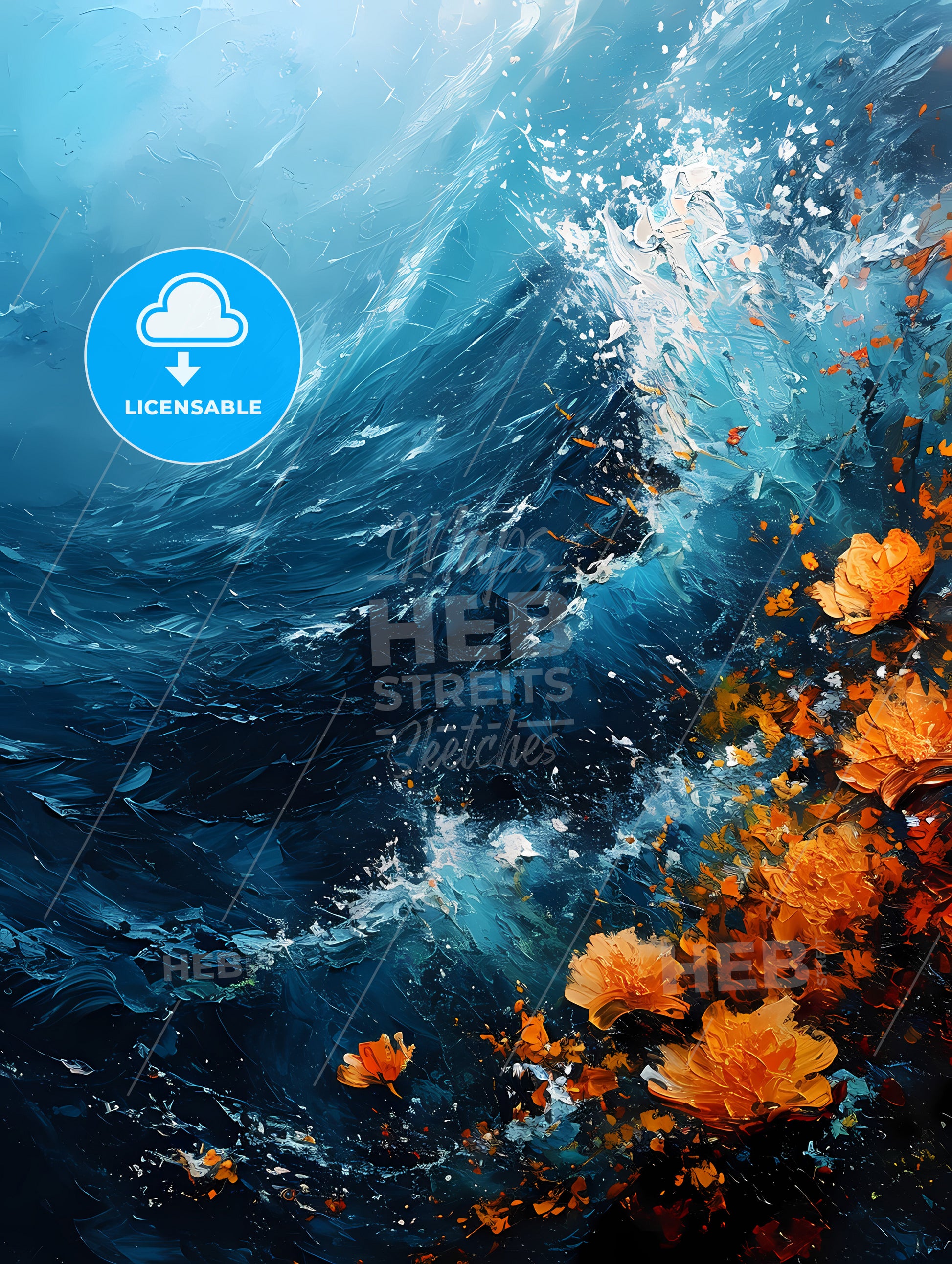 A Sea Of Dandelions Styled As Acrylic Art, Flowers On The Water. Stock Illustration generated with help of high resolution generative AI. License available for private and commercial use.