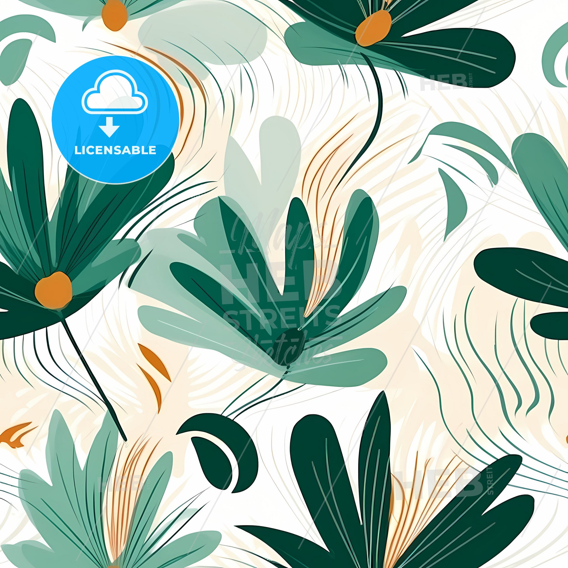 Abstract Flower Art Seamless Pattern, A Pattern Of Green And Orange Flowers. Stock Illustration generated with help of high resolution generative AI. License available for private and commercial use.