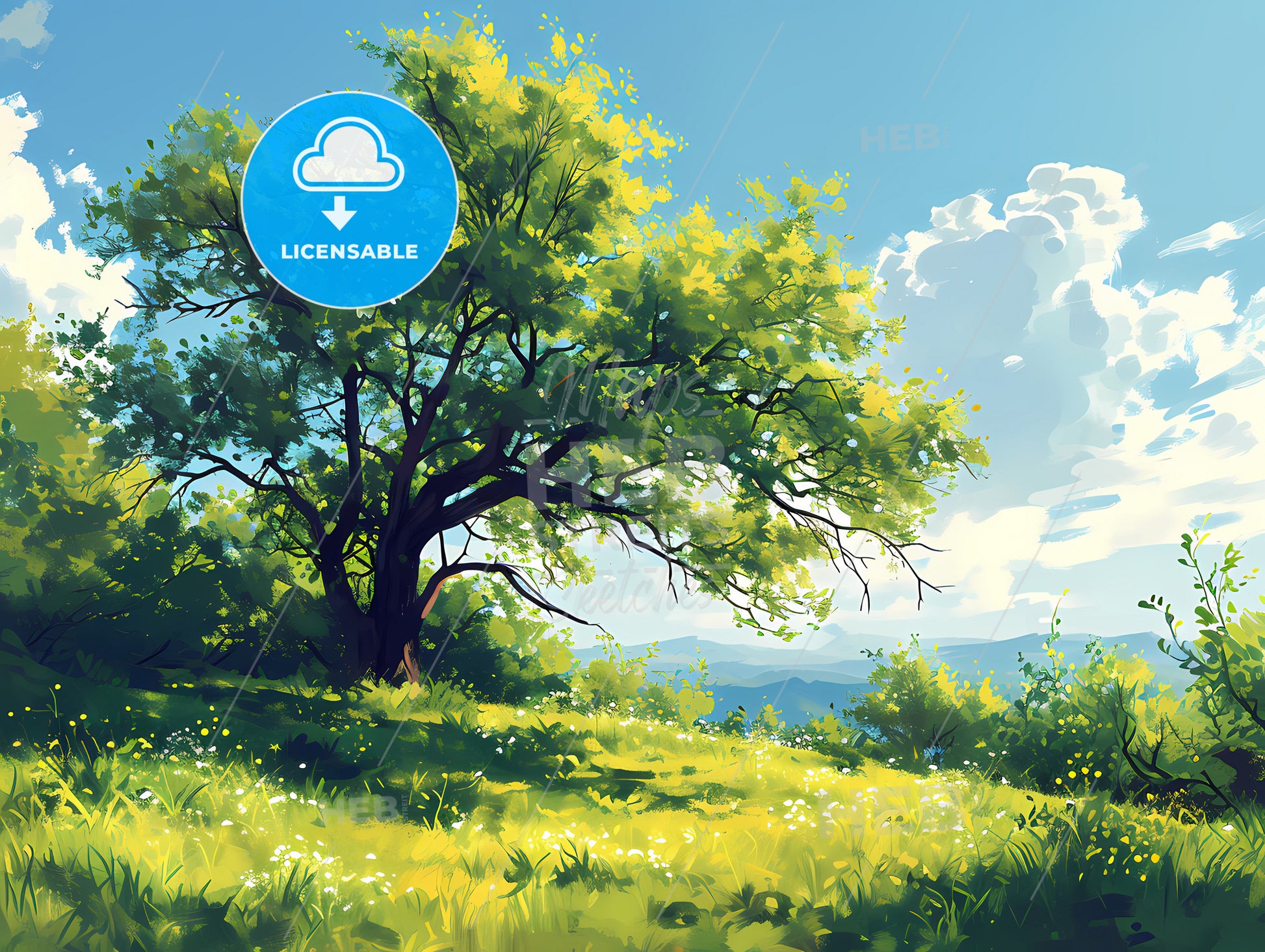 Beautiful Blurred Background Of Spring Nature, A Tree In A Grassy Field. Stock Illustration generated with help of high resolution generative AI. License available for private and commercial use.