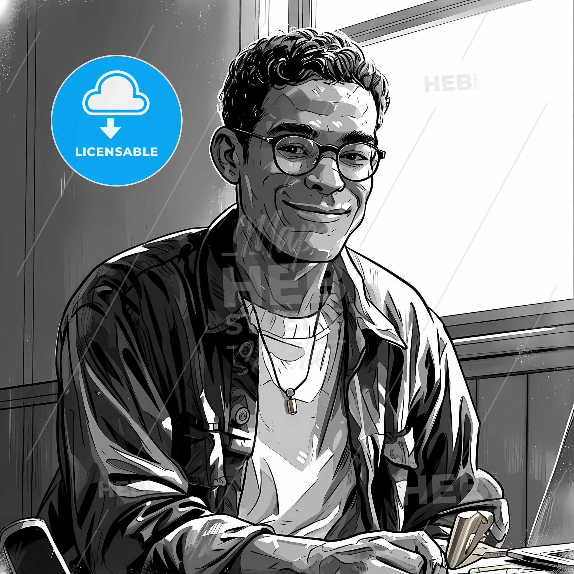 A Happy Man Sitting In A Lecture Room, A Man Smiling At A Computer. Stock Illustration generated with help of high resolution generative AI. License available for private and commercial use.