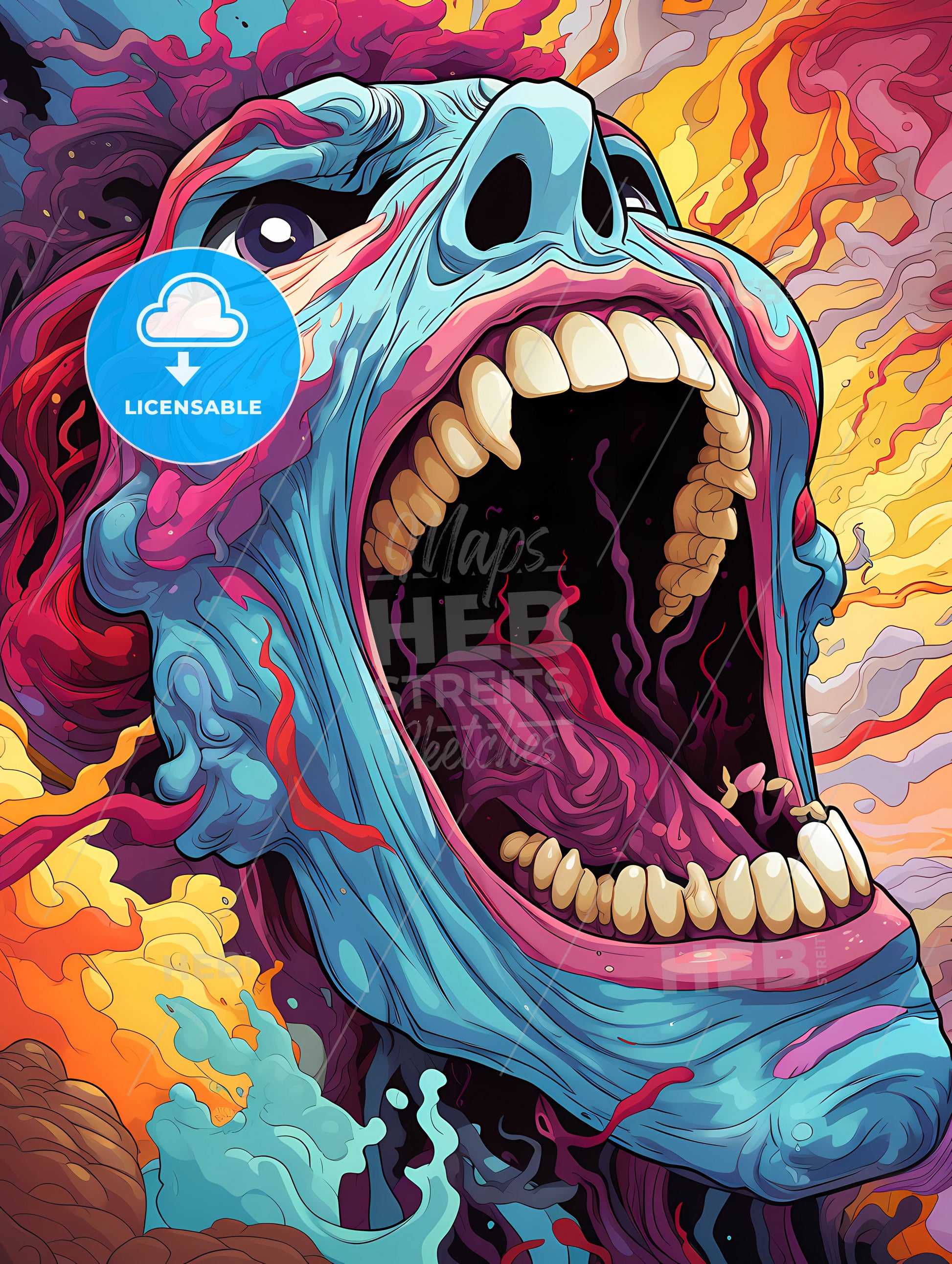 Low Dutch Angle Digital Acid, A Cartoon Of A Zombie With Colorful Flames. Stock Illustration generated with help of high resolution generative AI. License available for private and commercial use.