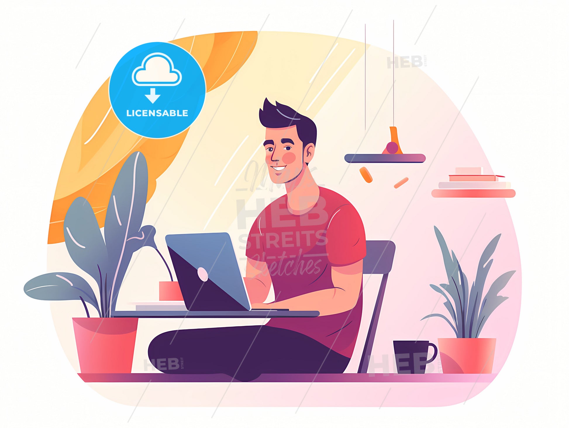 Young Man Working From Home, A Man Sitting At A Desk With A Laptop. Stock Illustration generated with help of high resolution generative AI. License available for private and commercial use.