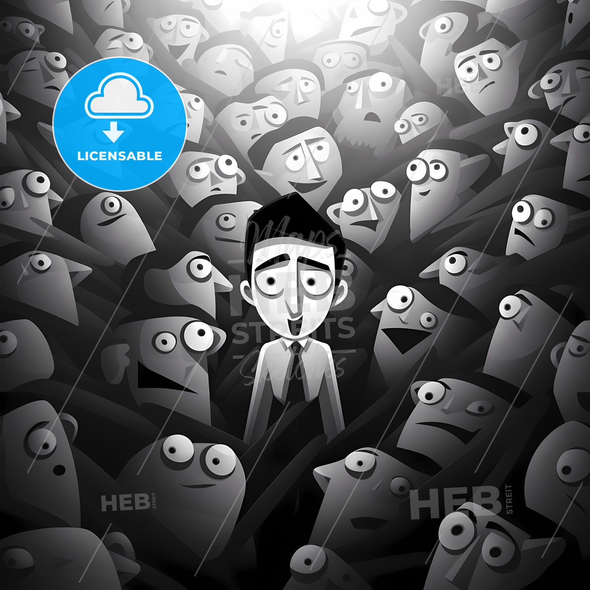 A Spotlighted Area, A Man Standing In A Crowd Of People. Stock Illustration generated with help of high resolution generative AI. License available for private and commercial use.