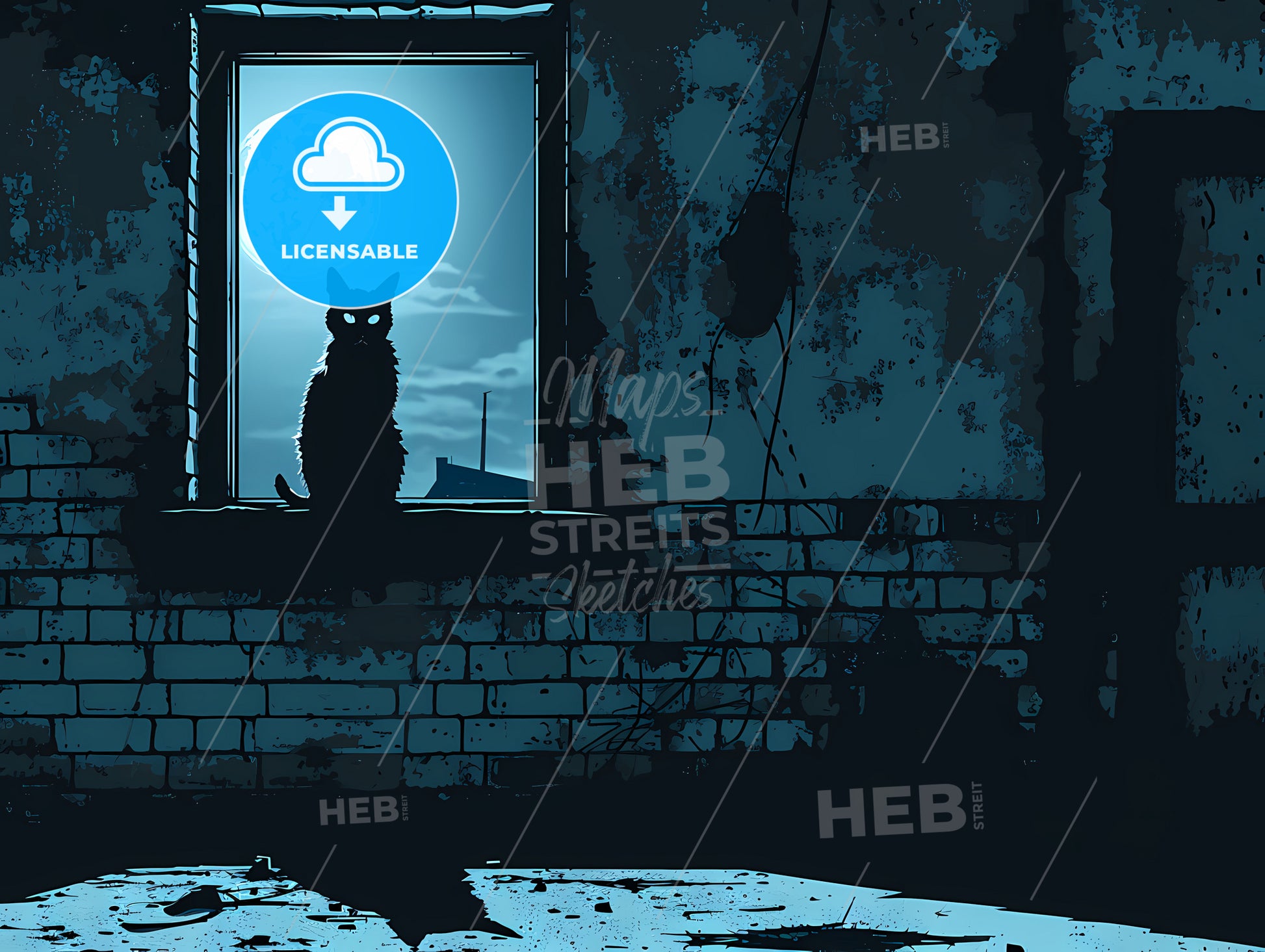 Cat In The Windowsill, A Cat Sitting On A Window Sill Looking Out A Window. Stock Illustration generated with help of high resolution generative AI. License available for private and commercial use.