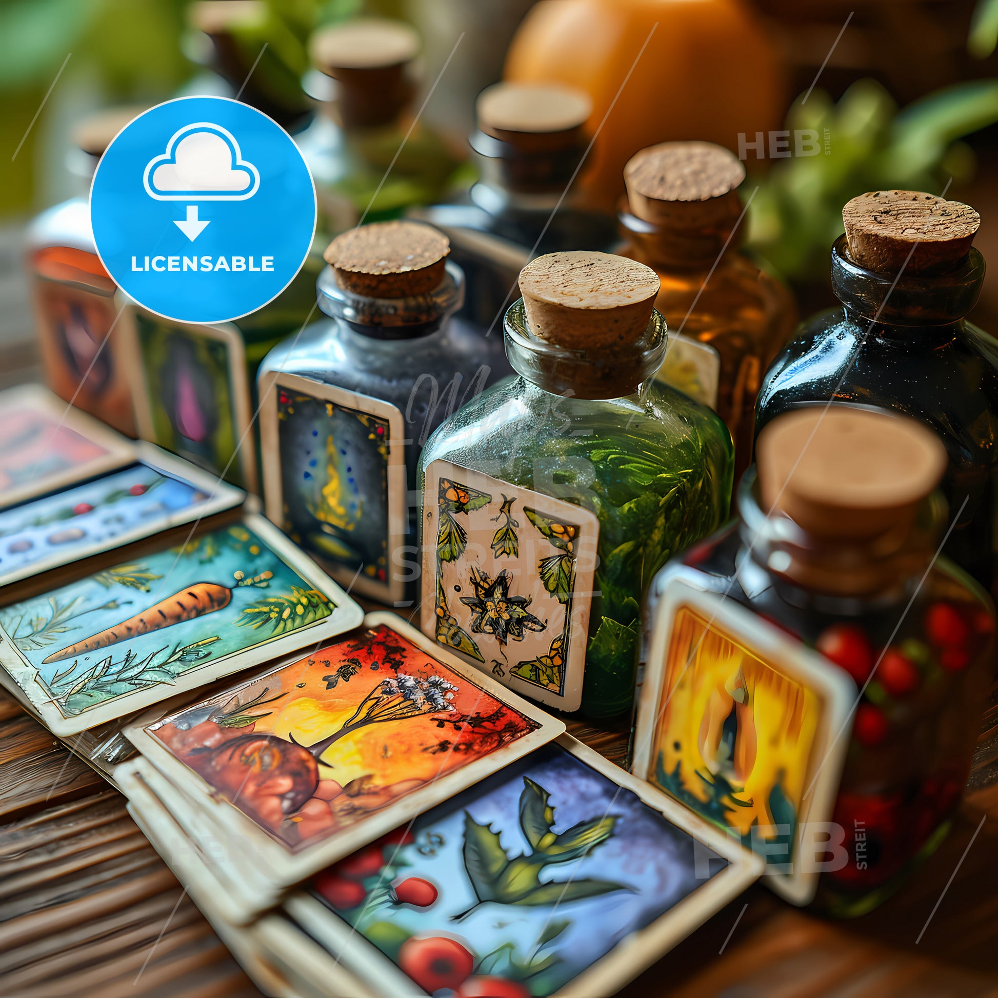 A Sticker Pack Of Modern Witch Accessories, A Group Of Bottles With Cards. Stock Illustration generated with help of high resolution generative AI. License available for private and commercial use.