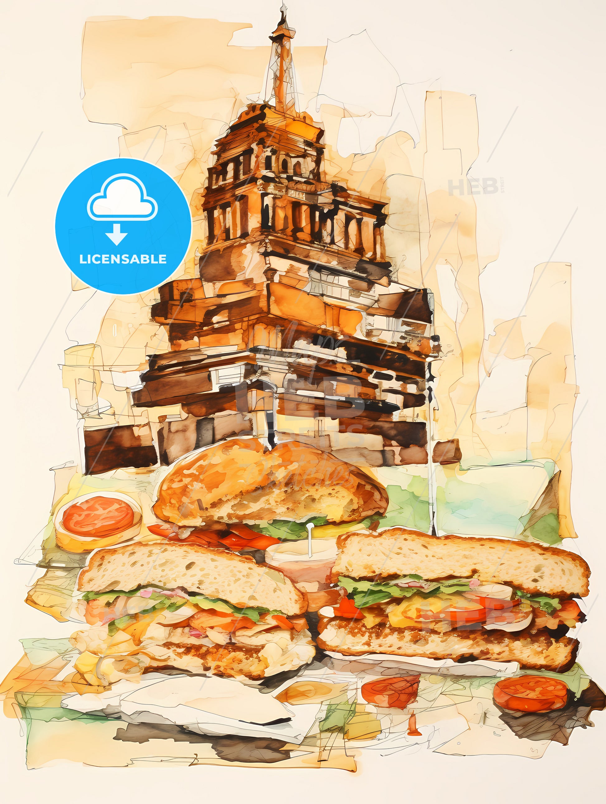 Illustration Of A Sandwich, A Watercolor Of A Sandwich And A Building. Stock Illustration generated with help of high resolution generative AI. License available for private and commercial use.