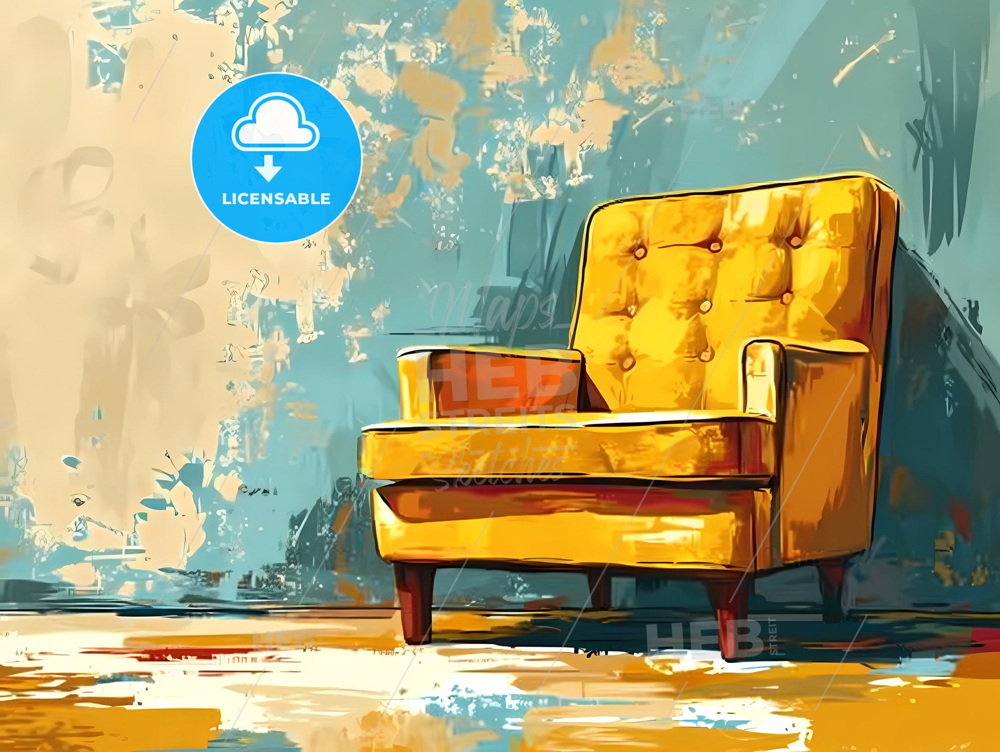 Technical Drawing Of A Modern Chair, A Yellow Chair In A Room. Stock Illustration generated with help of high resolution generative AI. License available for private and commercial use.