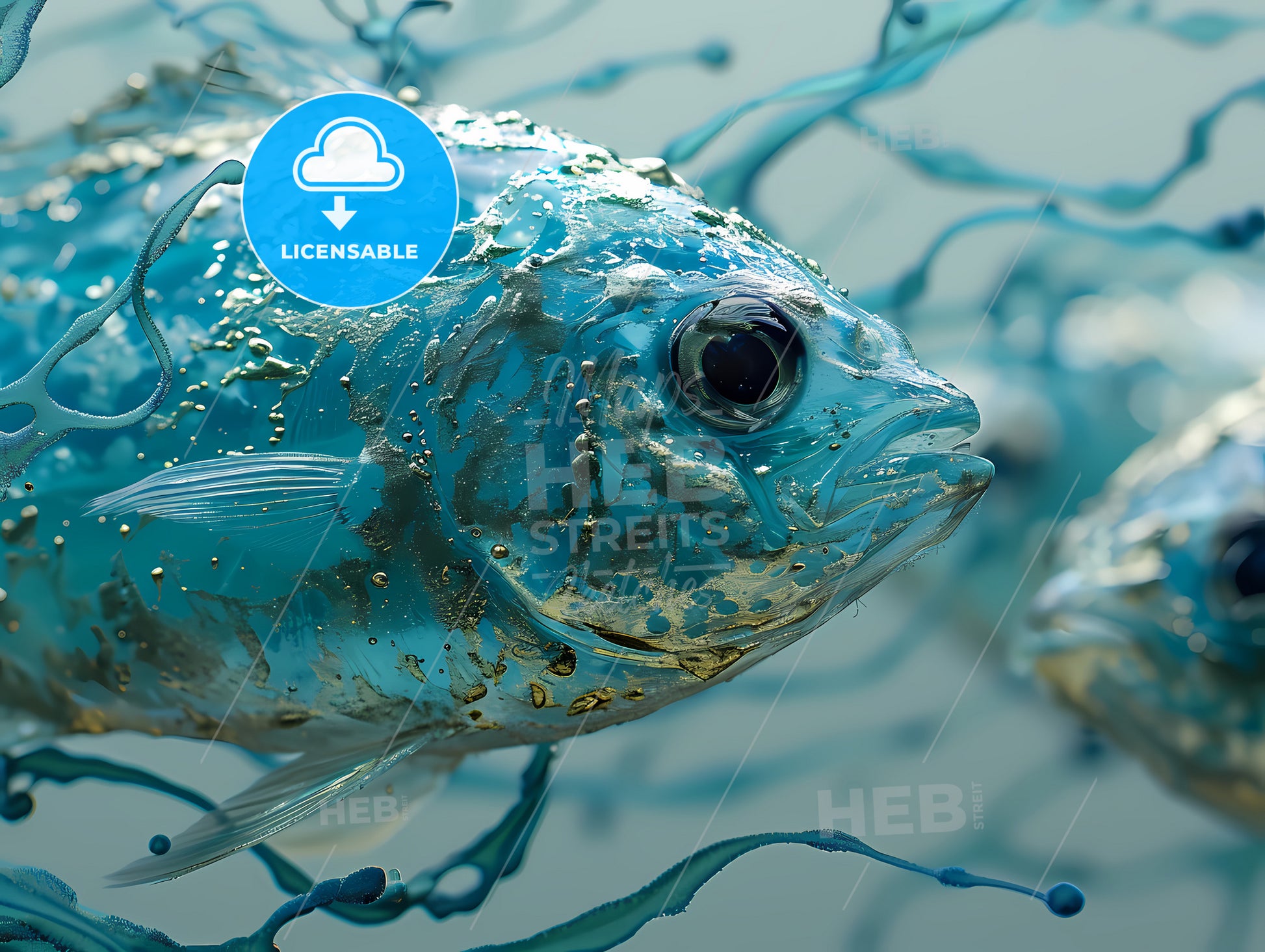 A Flying Fish Long Exposure Photography, A Blue Fish With Gold And Silver Paint. Stock Illustration generated with help of high resolution generative AI. License available for private and commercial use.