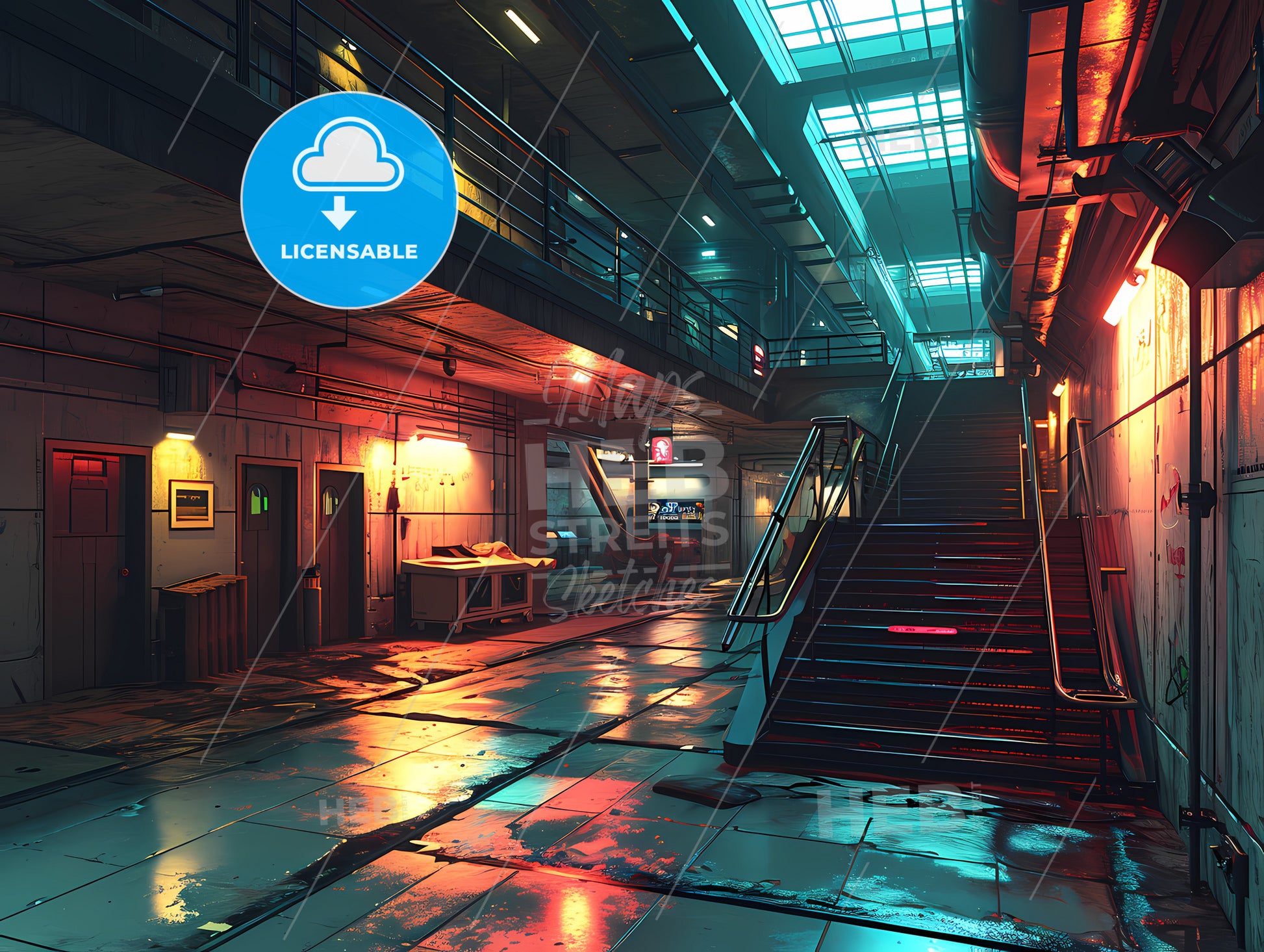 Risograph Of A Futuristic Cityscape, A Building With Stairs And A Staircase. Stock Illustration generated with help of high resolution generative AI. License available for private and commercial use.