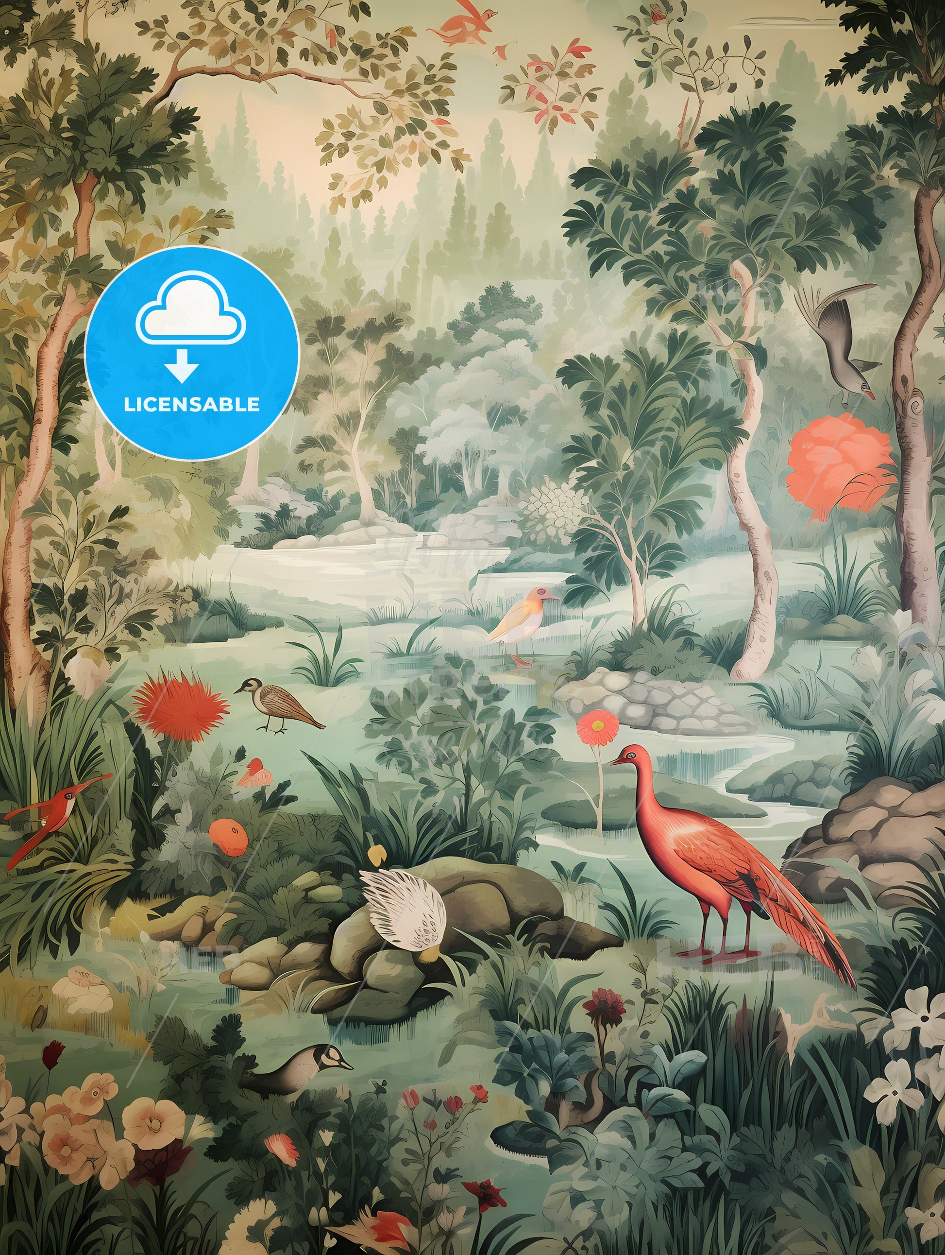 The Tapestry Is Green With Many Animals, A Mural Of Birds And Plants. Stock Illustration generated with help of high resolution generative AI. License available for private and commercial use.