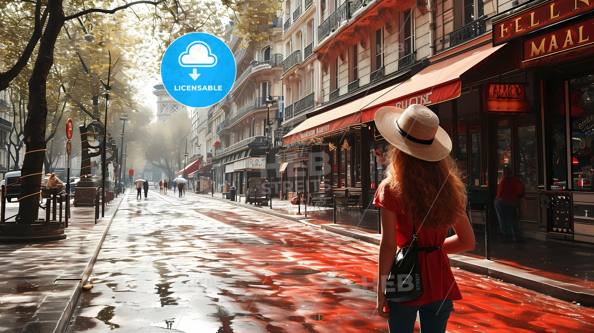 Une Lofi Girl Regardant, A Woman Walking Down A Wet Street. Stock Illustration generated with help of high resolution generative AI. License available for private and commercial use.