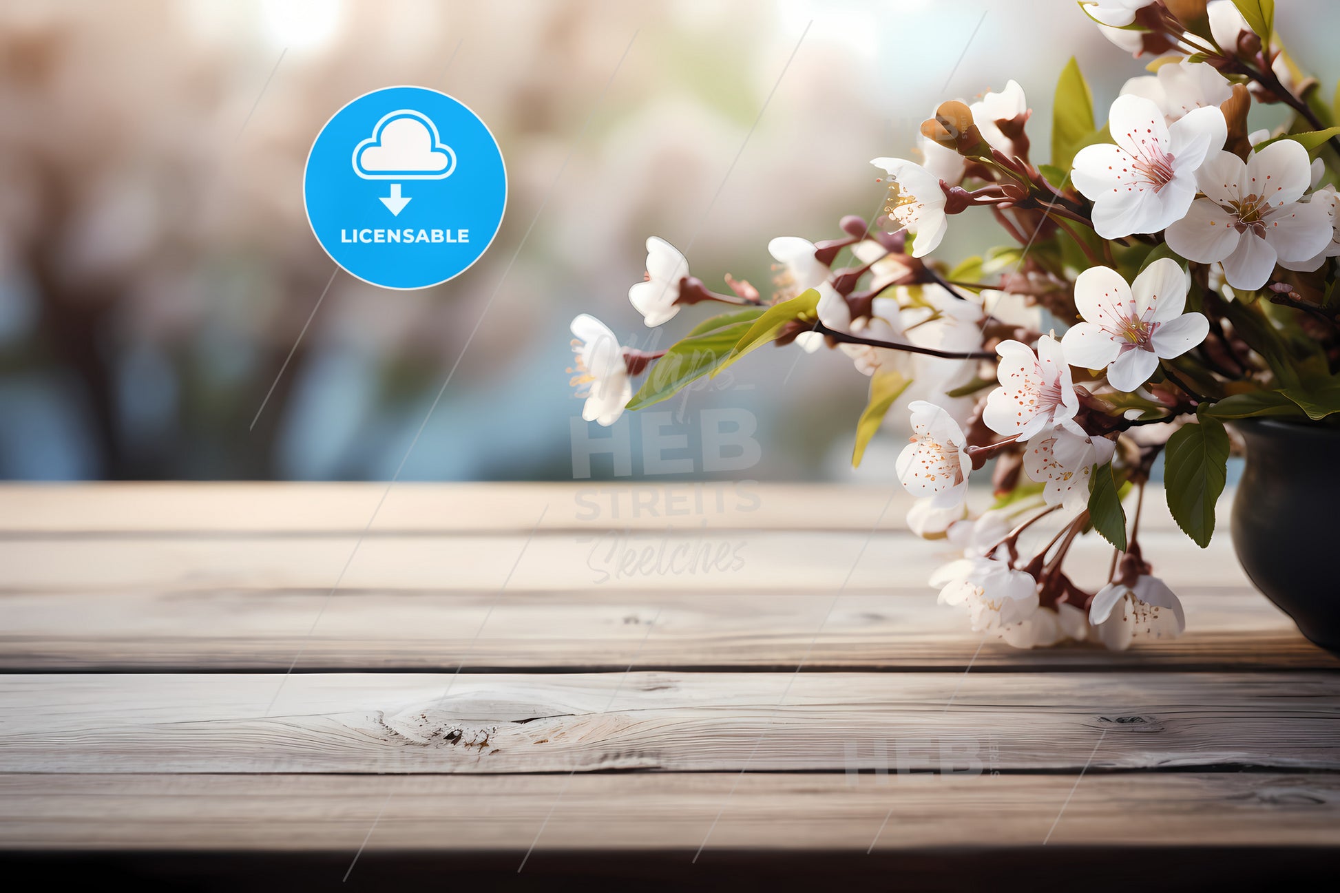 Wooden Table With Spring, A White Flowers On A Wooden Surface. Stock Illustration generated with help of high resolution generative AI. License available for private and commercial use.