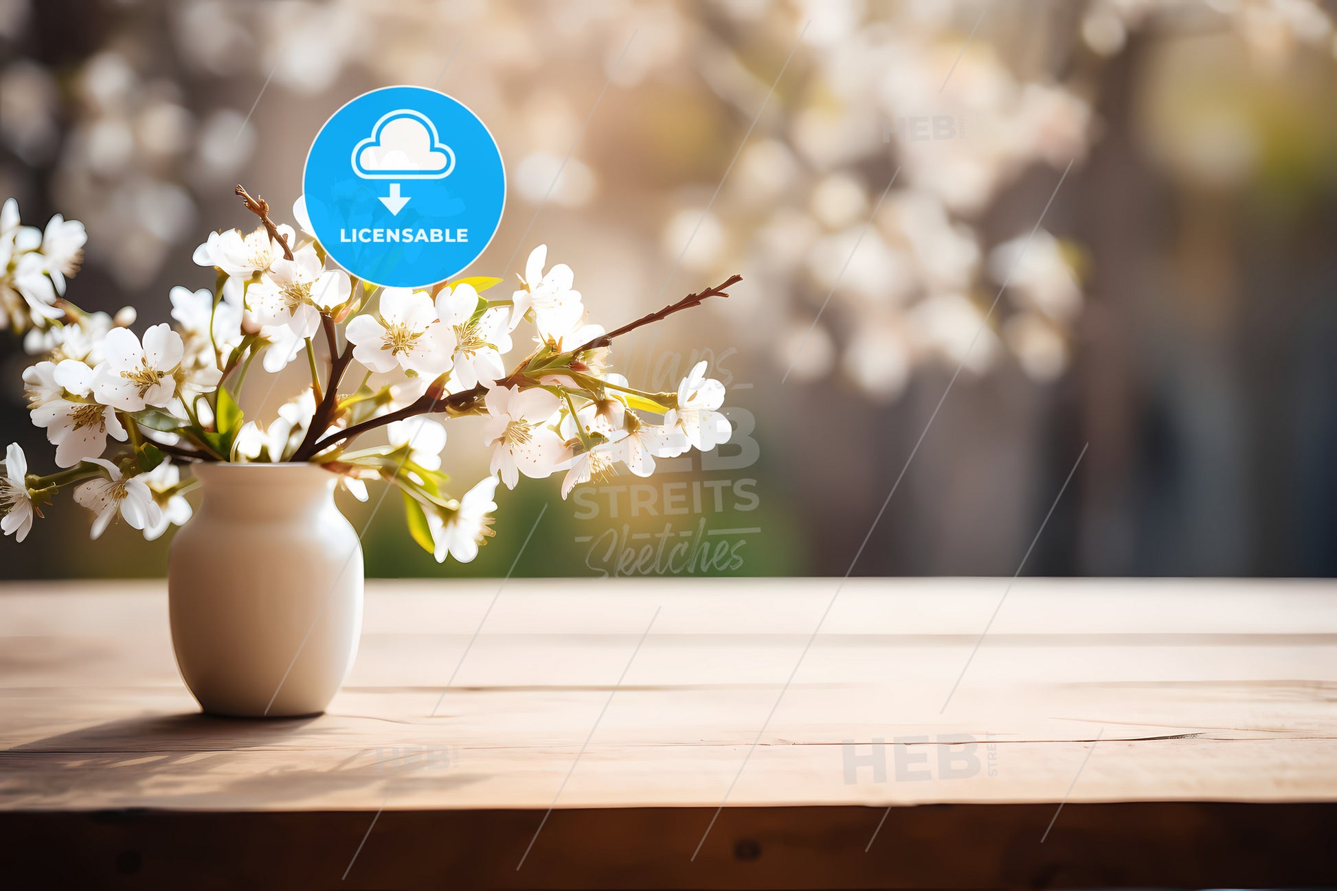 Wooden Table With Spring, A White Flowers In A Vase On A Wooden Table. Stock Illustration generated with help of high resolution generative AI. License available for private and commercial use.