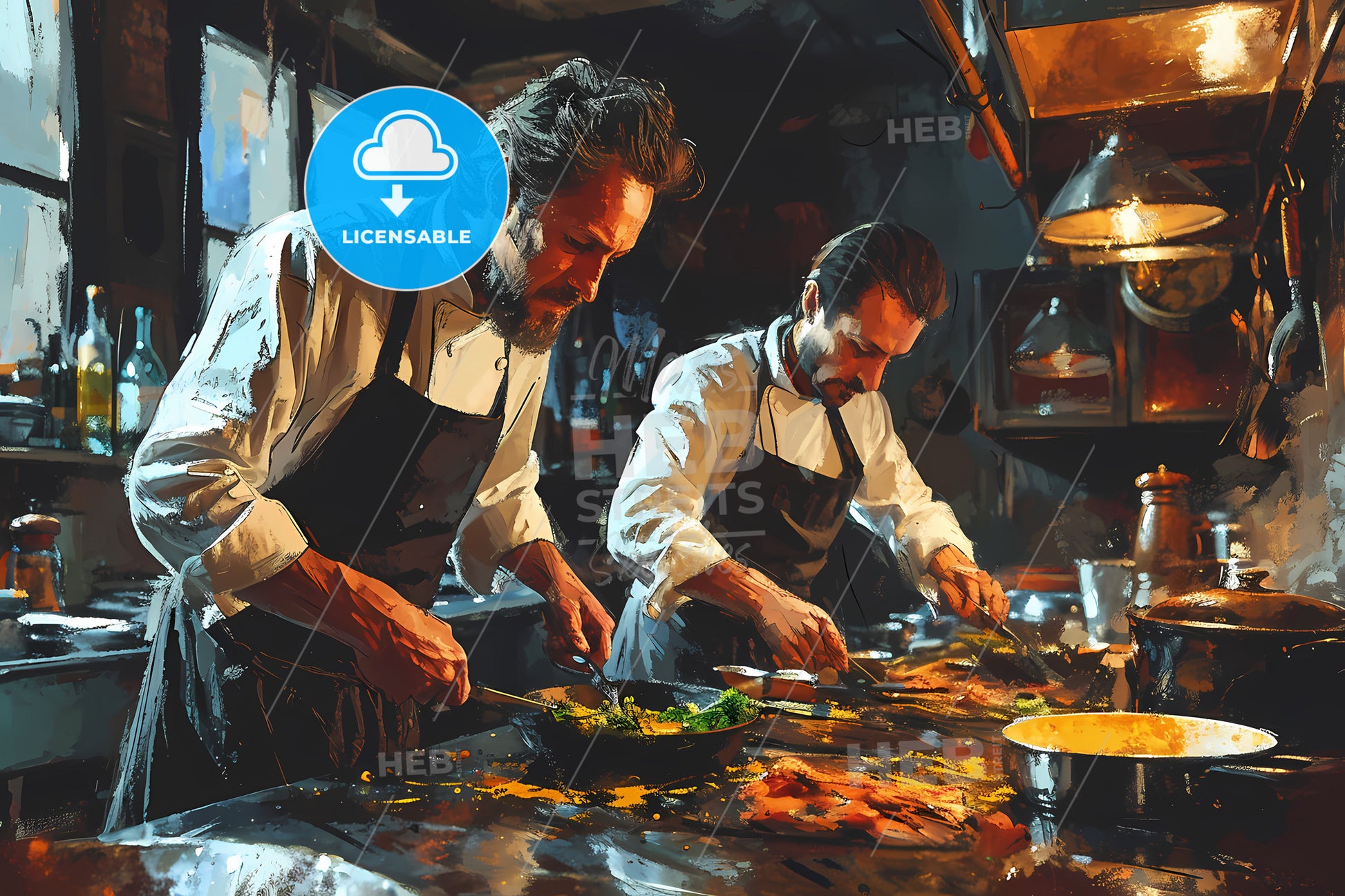 Extended Family Cooking Barbecue, Two Men Cooking In A Kitchen. Stock Illustration generated with help of high resolution generative AI. License available for private and commercial use.