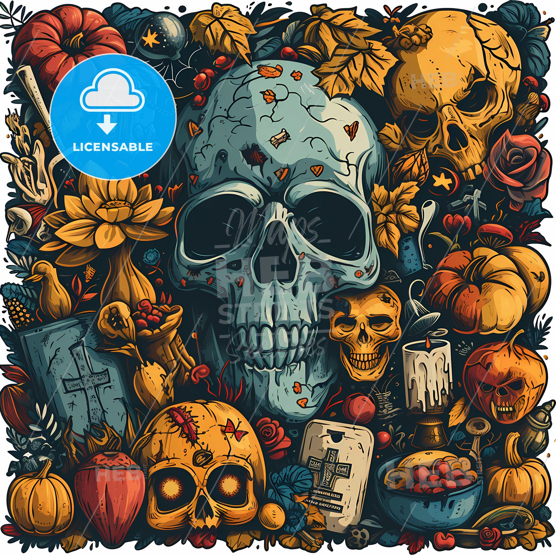 Set Of Vibrant And Expressive Stickers, A Skull Surrounded By Different Objects. Stock Illustration generated with help of high resolution generative AI. License available for private and commercial use.