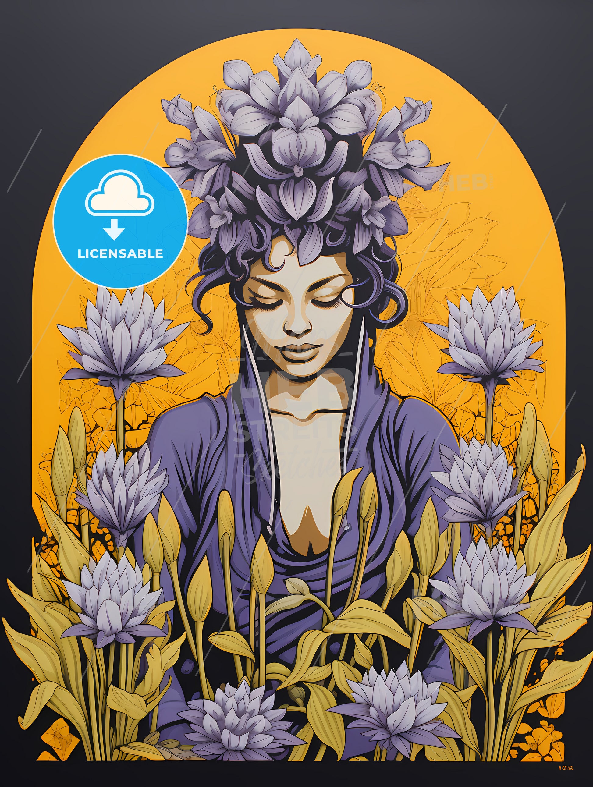 Linocut Print Minimalism, A Woman With Flowers In Her Hair. Stock Illustration generated with help of high resolution generative AI. License available for private and commercial use.