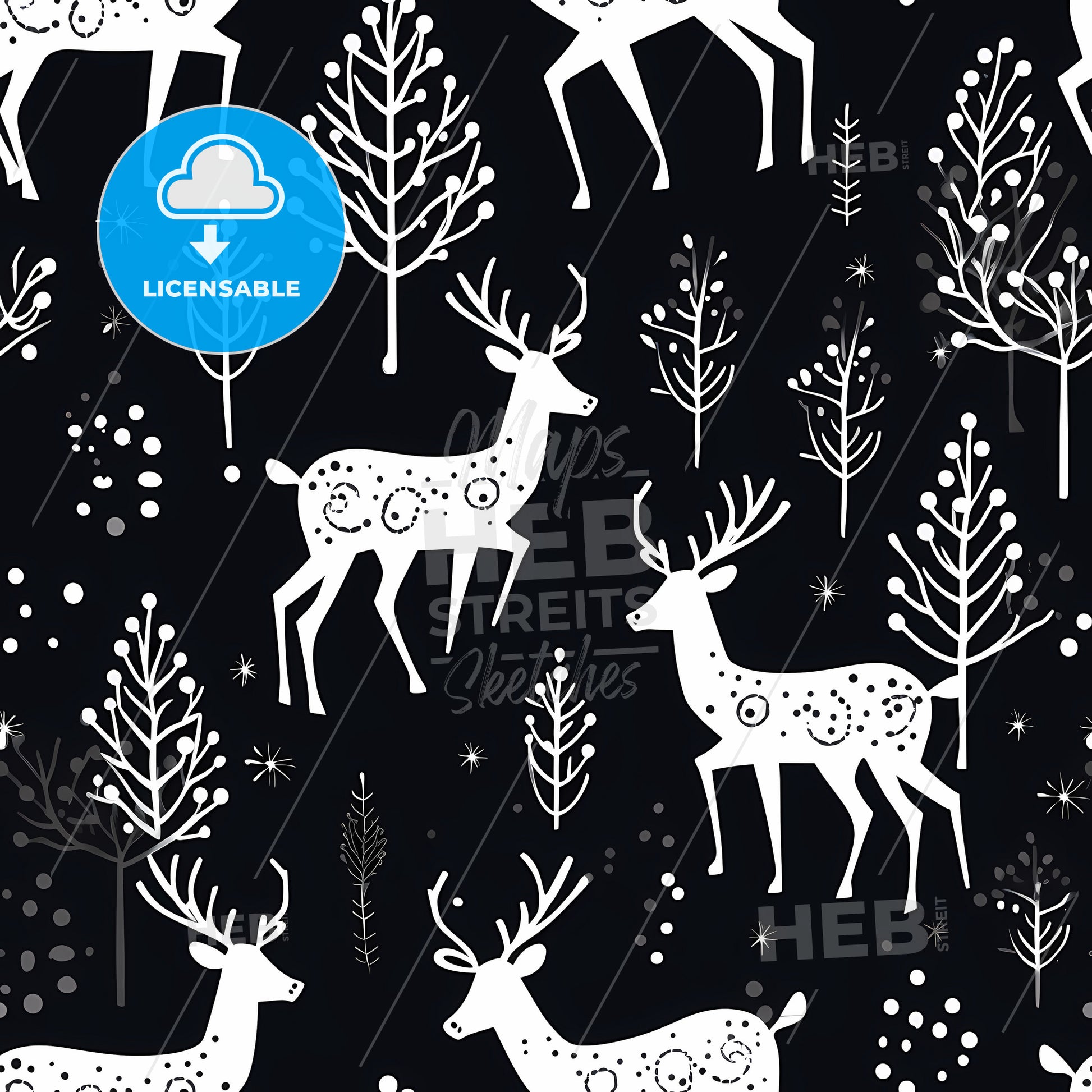 Hand Drawn Christmas Deer, A Pattern Of White Deer And Trees. Stock Illustration generated with help of high resolution generative AI. License available for private and commercial use.