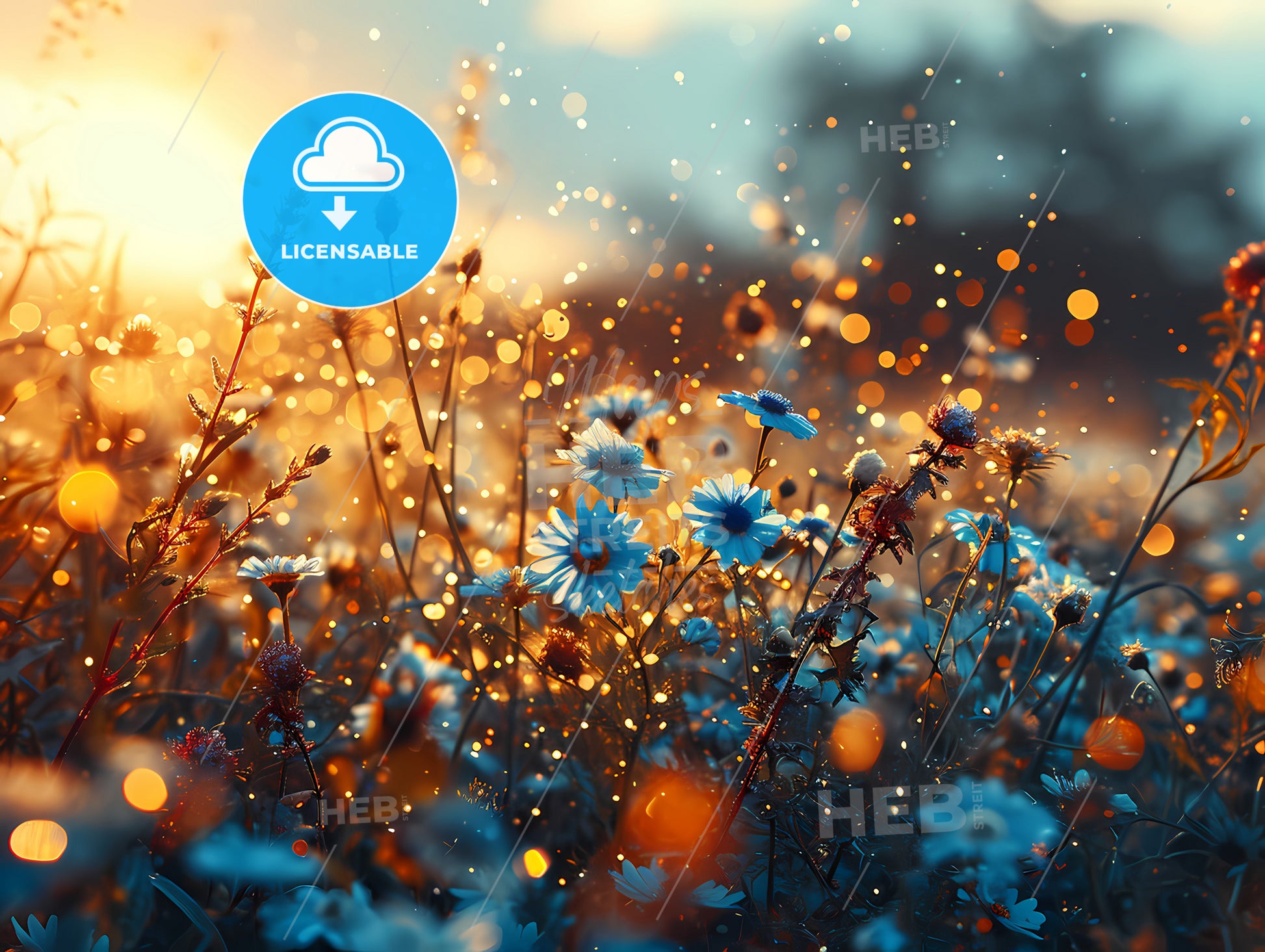 Beautiful Field Meadow Flowers Chamomile, A Field Of Flowers With The Sun Shining Through. Stock Illustration generated with help of high resolution generative AI. License available for private and commercial use.