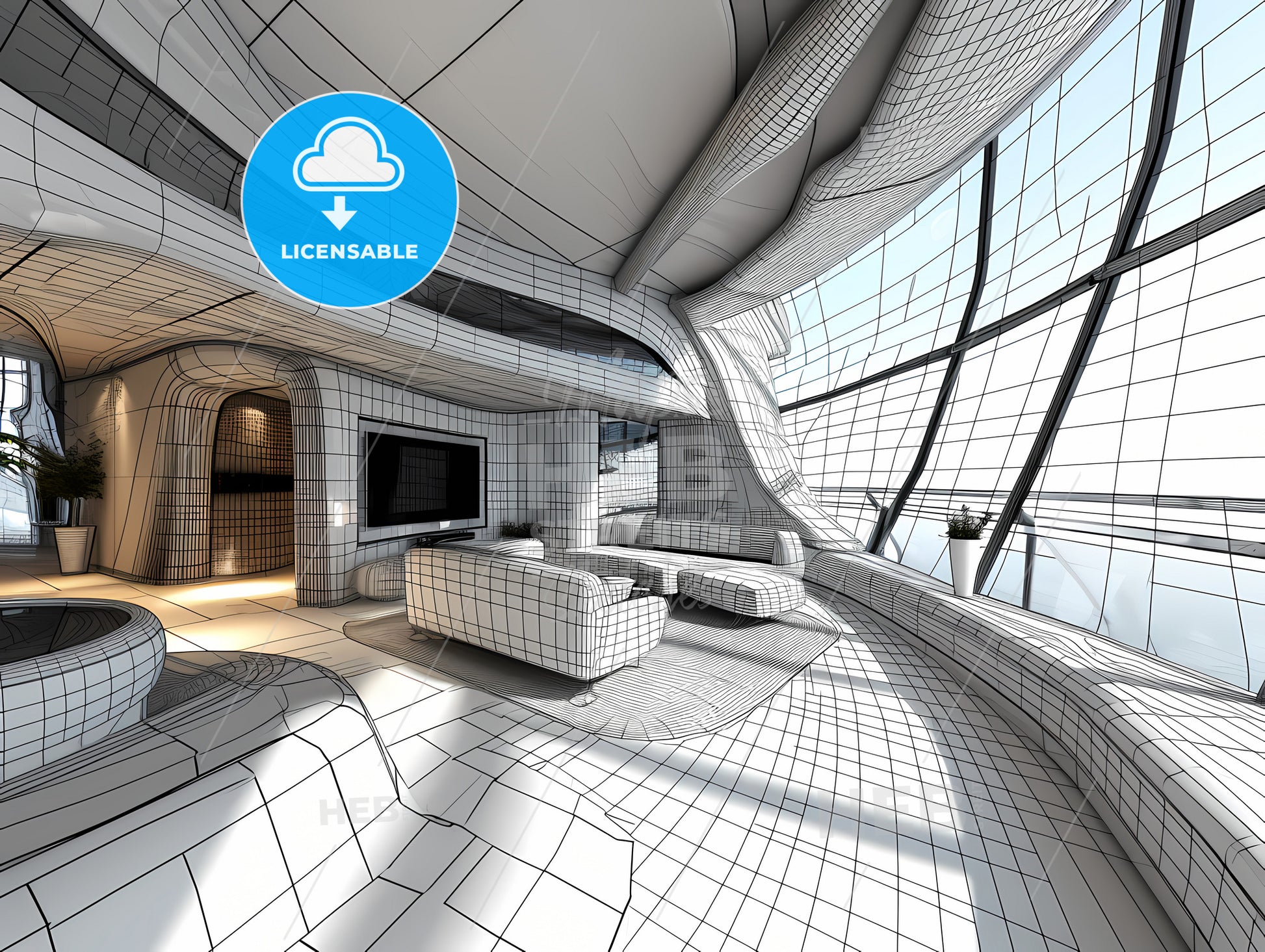 A Cozy Living Room With A Fireplace, A Room With A Large Window. Stock Illustration generated with help of high resolution generative AI. License available for private and commercial use.