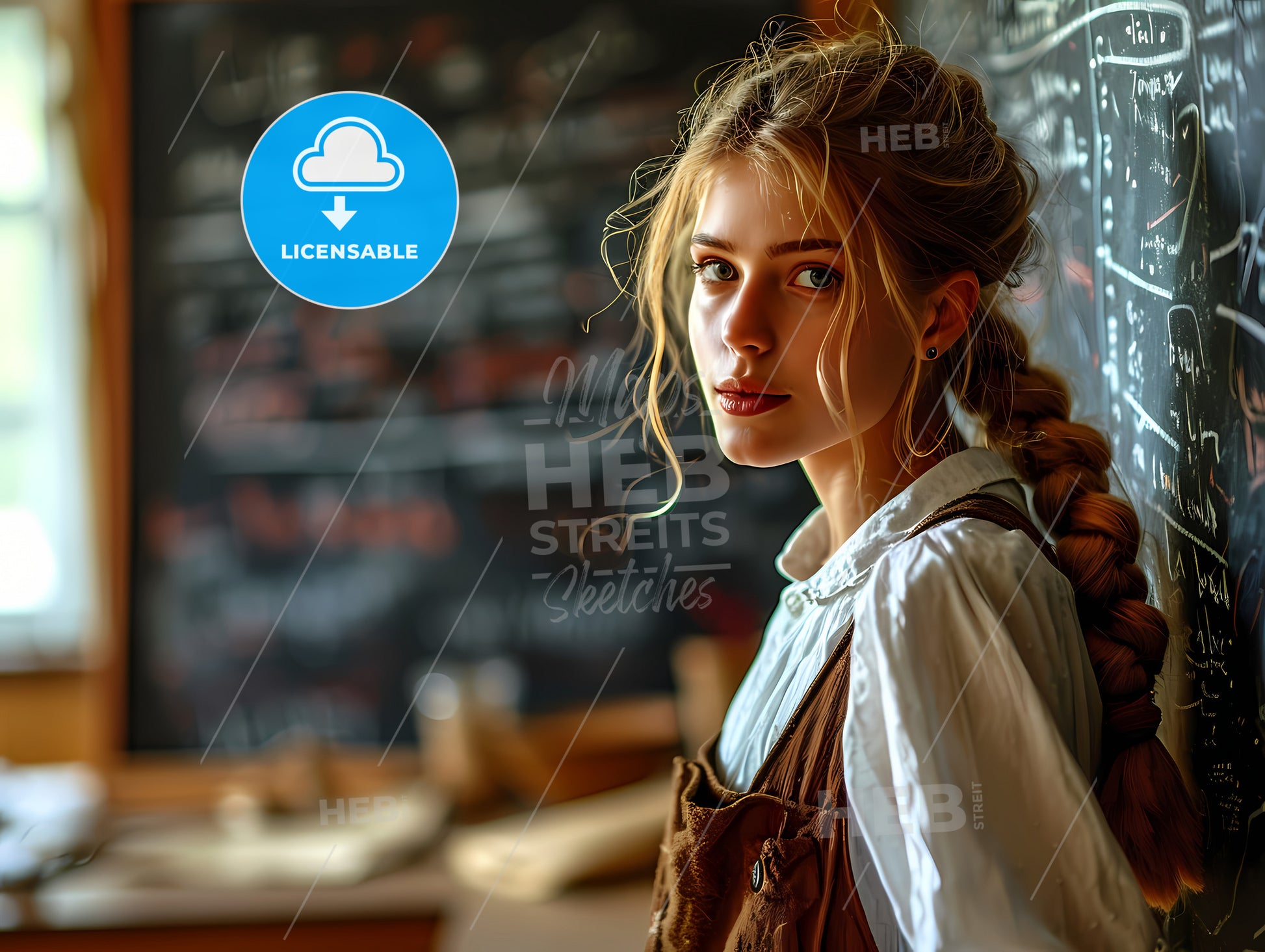 A Woman School Teacher, A Woman Standing In Front Of A Chalkboard. Stock Illustration generated with help of high resolution generative AI. License available for private and commercial use.