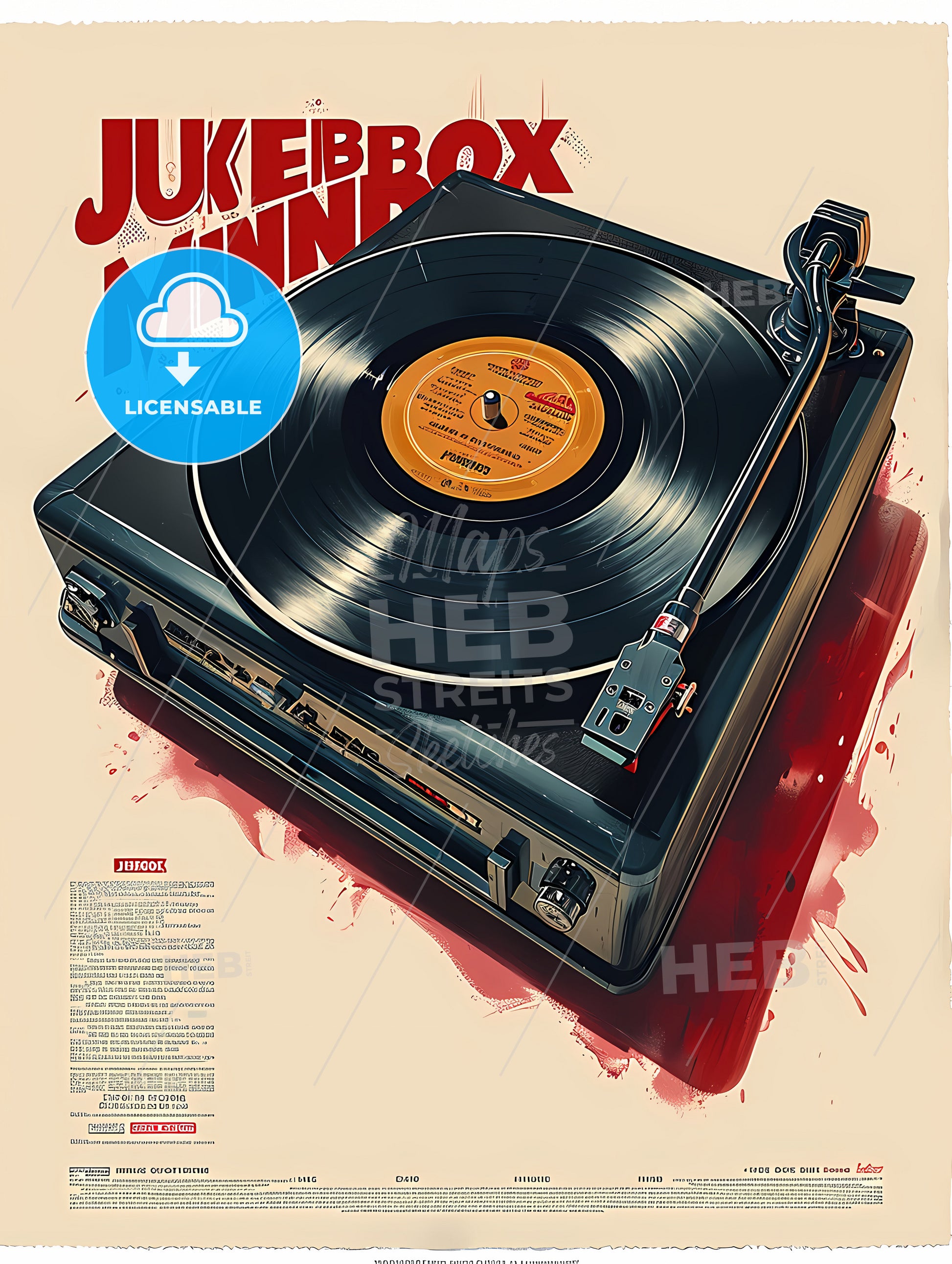 Simple Music Poster With The Text Jukebox Mind, A Record Player With A Record On It. Stock Illustration generated with help of high resolution generative AI. License available for private and commercial use.