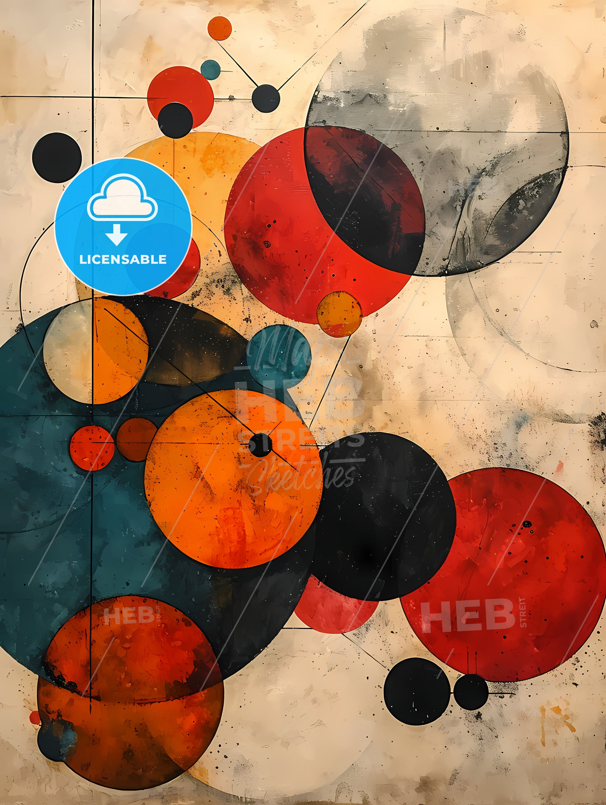 Neutral Beige Mid Century Modern Art Painting, A Colorful Circles And Lines. Stock Illustration generated with help of high resolution generative AI. License available for private and commercial use.