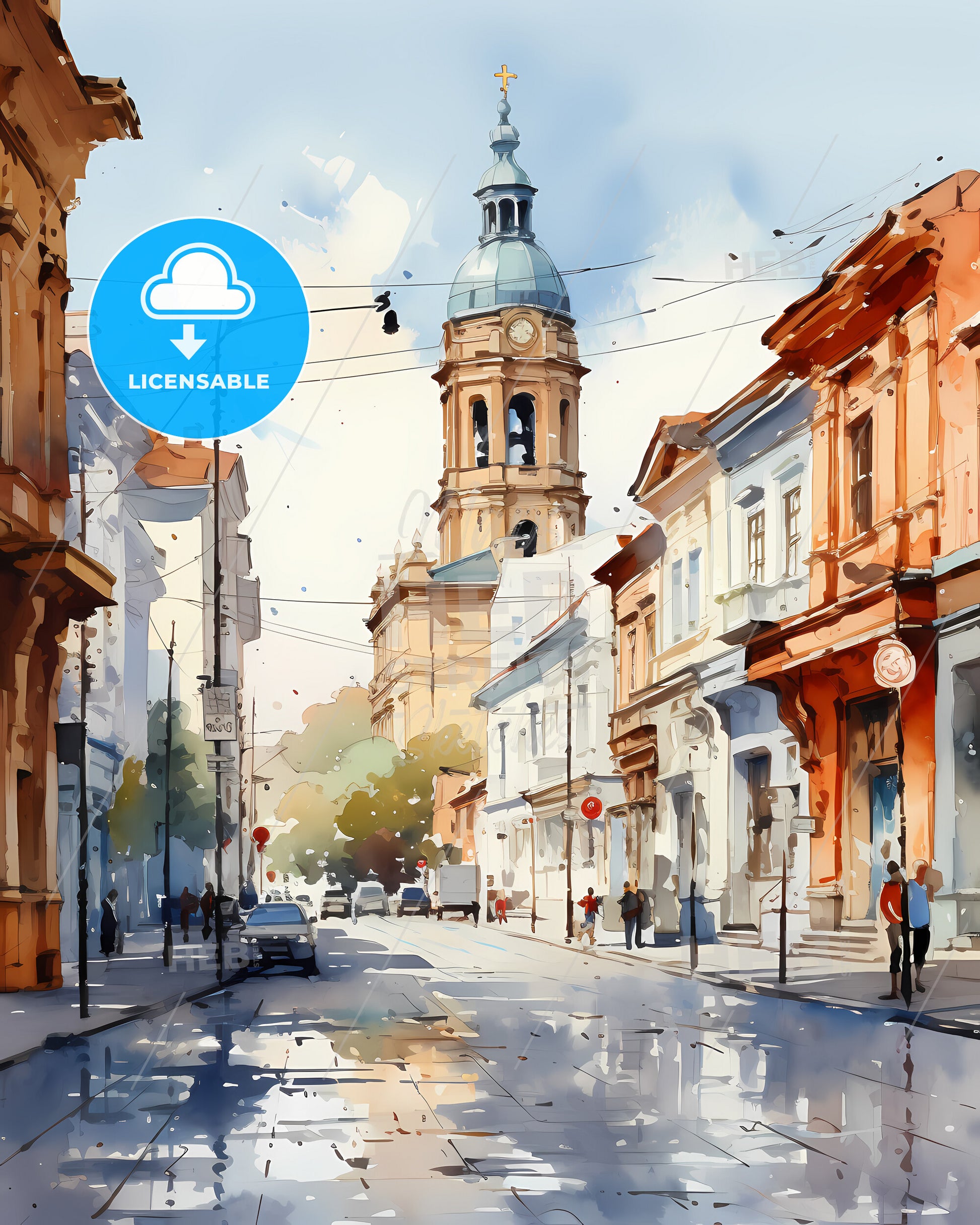 Bucharest, Romania - A Watercolor Of A Street With Buildings And A Tower