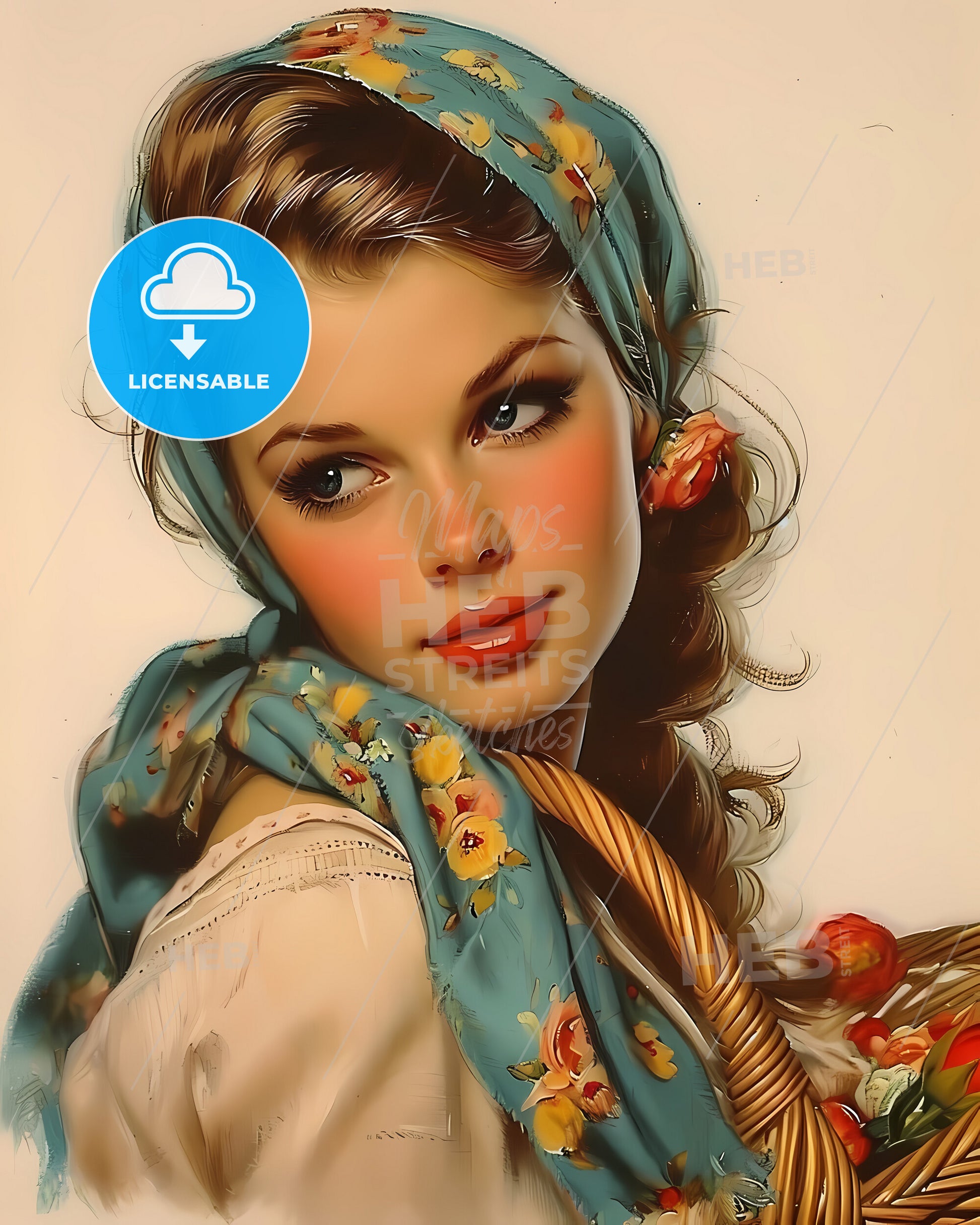 Stunning Girl Holding Picknic Basket - A Woman With A Scarf Around Her Head