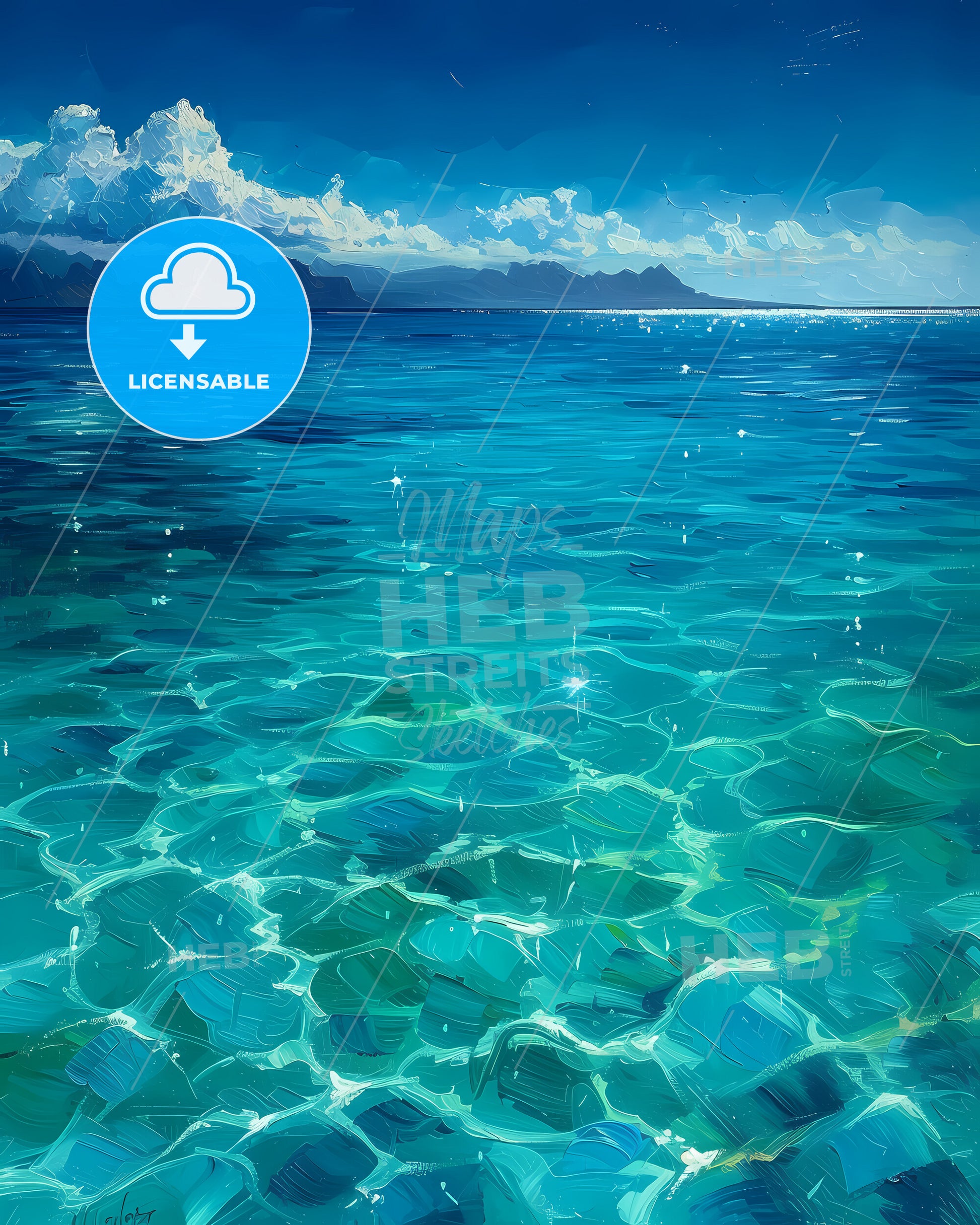 Lake Malawi, Malawi. Africa's third-largest lake, known for its clear waters and diverse fish species. Art painting with deep blue sky an a focus on the turquoise clear water. Only some bright higher clouds in the distance. Style of impressionistic colorful painting made with acrylic colors, nice strokes and outlines. Large area of copy space on top. Some litte bright sparkles.