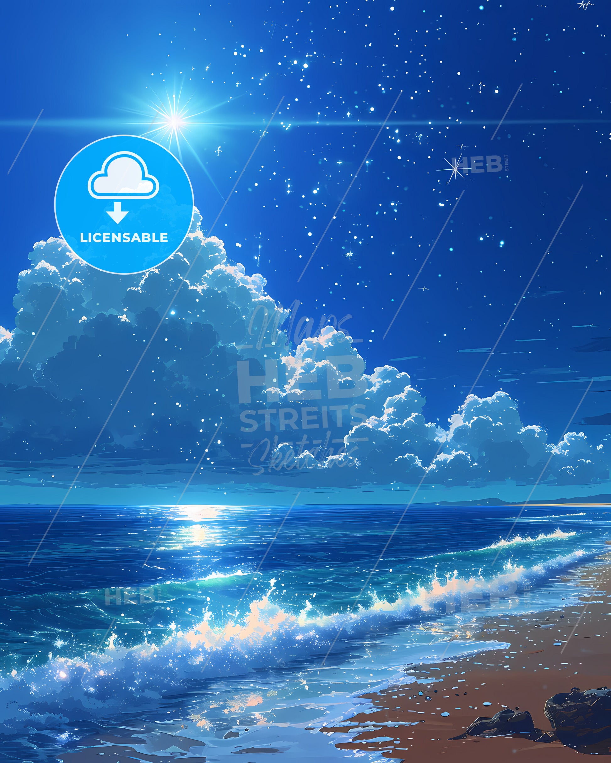 Agonda Beach, India. Agonda Beach is a serene and less crowded beach known for its natural beauty and calm waters. Art painting with deep blue sky at a bright sunny day. Only some bright higher clouds in the distance. Style of 2d flat game art illustration. 64k high resolution. Large area of copy space on top. litte bright sparkles.