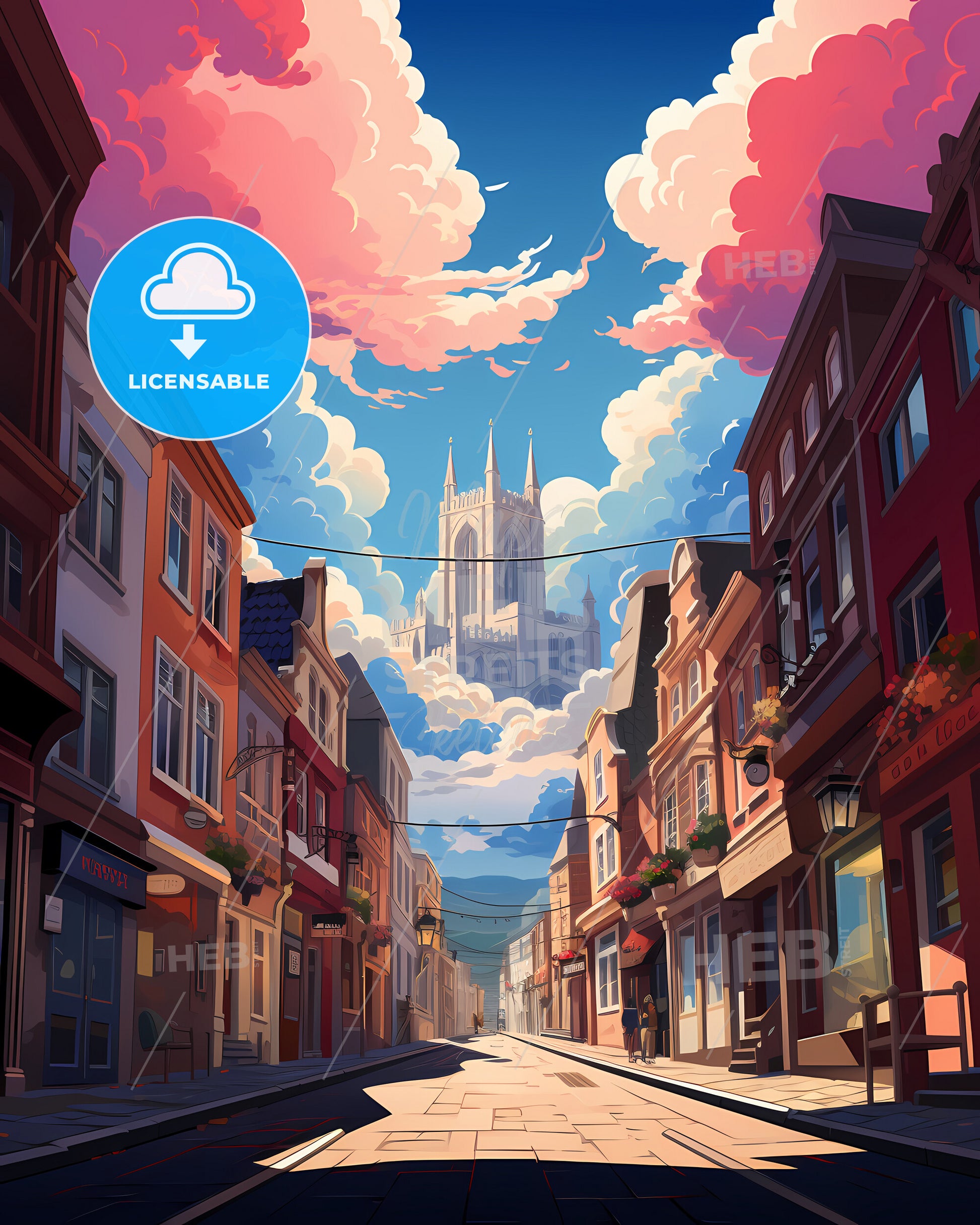 Streetart in Ghent, Belgium. Urban city scene, Watercolor Painting, oil Painting, Colorful Art Painting, oil painting like paper art, travel art sunny day, in the style of pink and crimson, Beautiful white Cloud, Blue Sky Painting, Graphic excellence. Large area of copy space on top. dark Orange and retro Red, dark turquoise and yellow, minimal shading, panoramic View