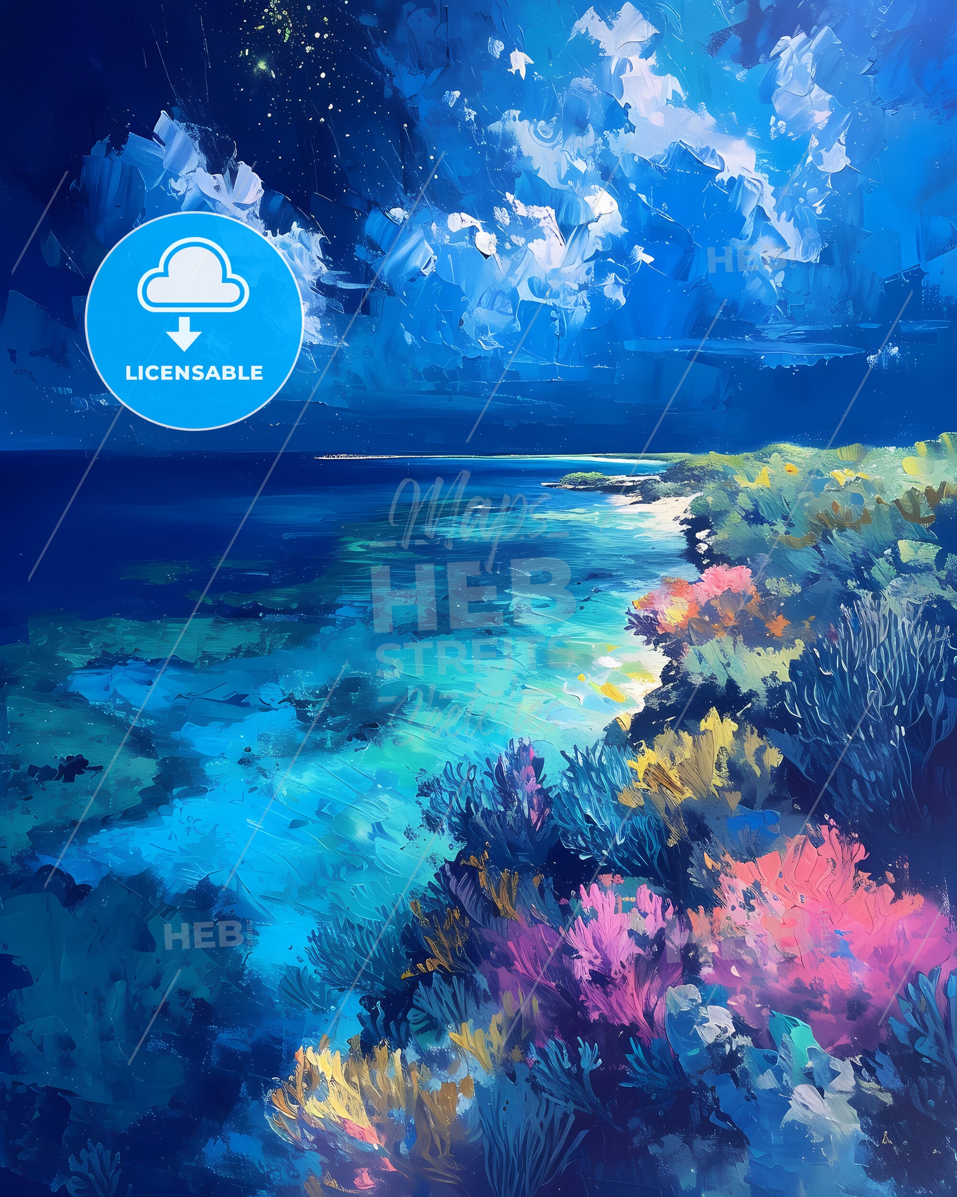 Mnemba Island, Tanzania. A private island surrounded by coral reefs, perfect for snorkeling and diving. Art painting with deep blue sky. Only some bright higher clouds in the distance. Style of impressionistic colorful painting made with acrylic colors, nice strokes and outlines. Big area of copy space on top. Some litte bright sparkles.