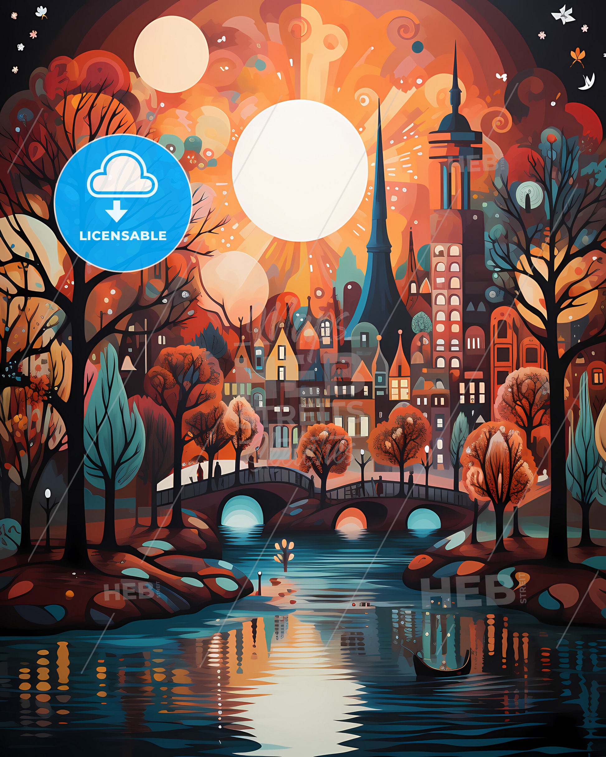 Almere, Netherlands - A Painting Of A City With Trees And A Bridge And A Boat