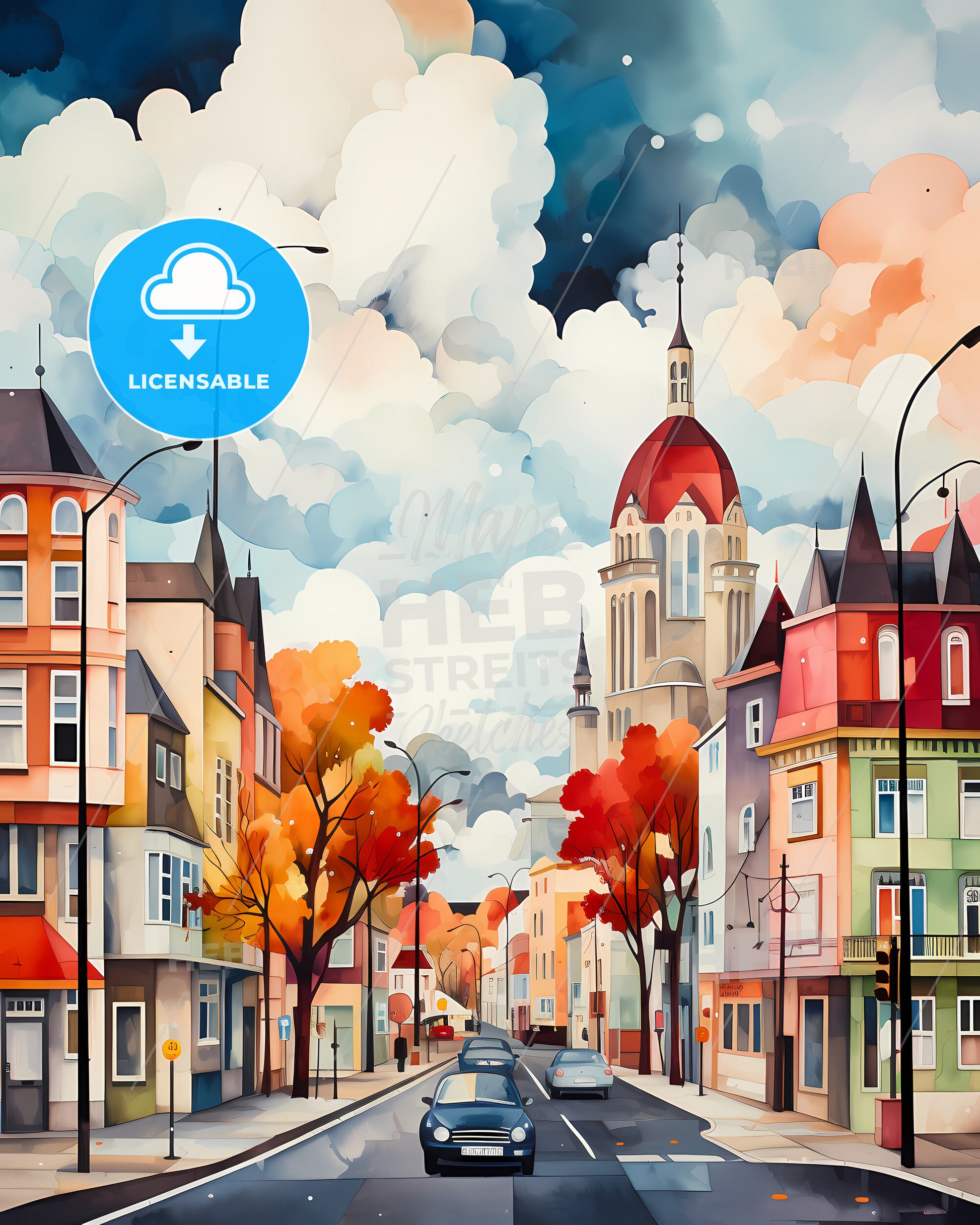 Streetart in Almere, Netherlands. Urban city scene, Watercolor Painting, oil Painting, Colorful Art Painting, oil painting like paper art, travel art sunny day, in the style of pink and crimson, Beautiful white Cloud, Blue Sky Painting, Graphic excellence. Large area of copy space on top. dark Orange and retro Red, dark turquoise and yellow, minimal shading, panoramic View