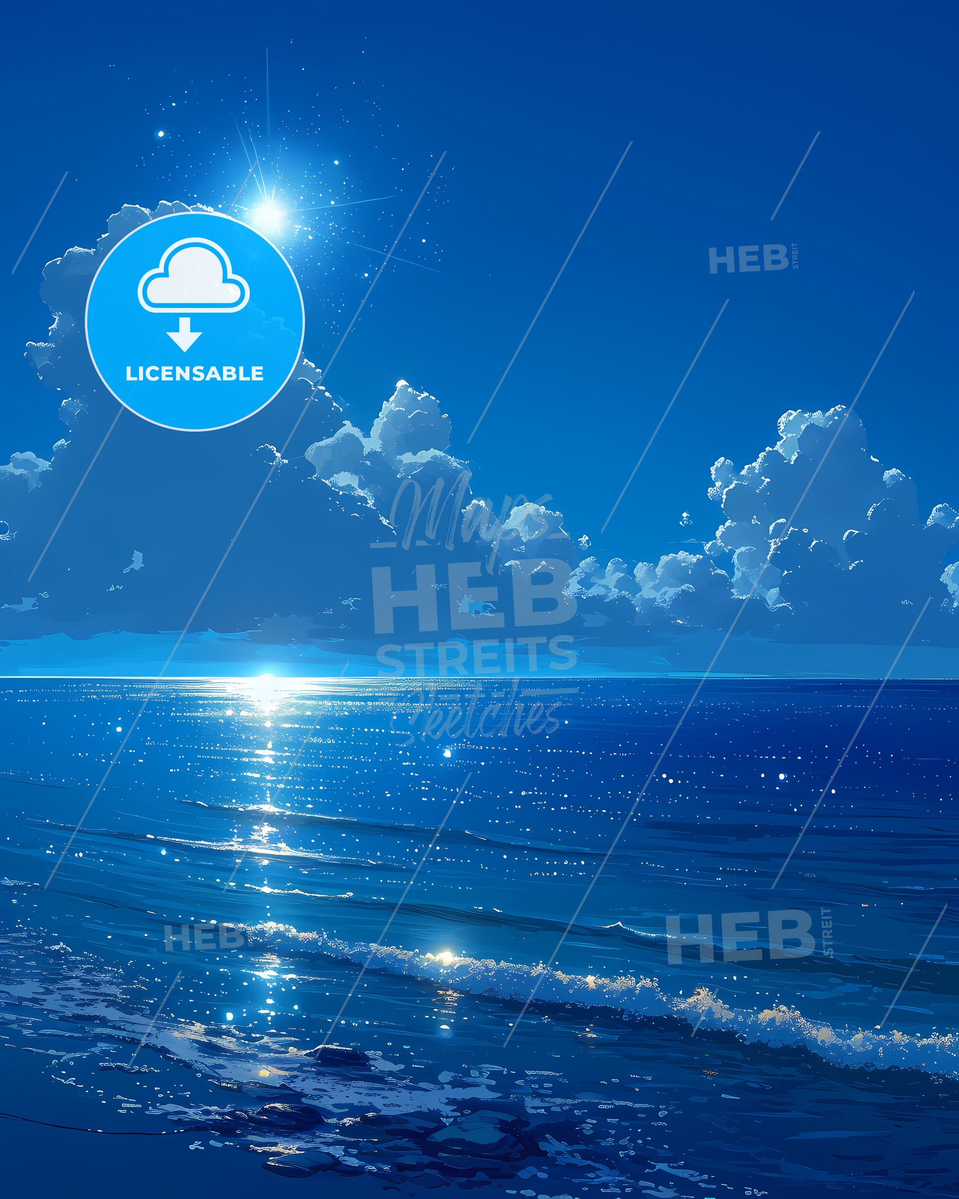 Zlatni Rat (Golden Horn Beach). Zlatni Rat is a unique beach with a distinctive shape that changes with the tide and wind direction. Art painting with deep blue sky at a bright sunny day. Only some bright higher clouds in the distance. Style of 2d flat game art illustration. 64k high resolution. Large area of copy space on top. litte bright sparkles.