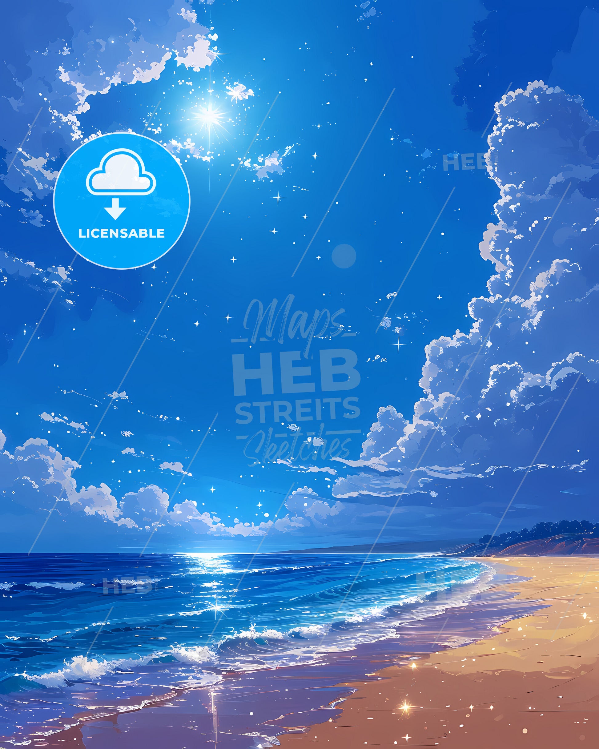 Kuta Beach Beach, Indonesia. Kuta Beach in Bali is a popular surfing destination with a lively atmosphere, golden sands, and vibrant sunsets. Art painting with deep blue sky at a bright sunny day. Only some bright higher clouds in the distance. Style of 2d flat game art illustration. 64k high resolution. Large area of copy space on top. litte bright sparkles.