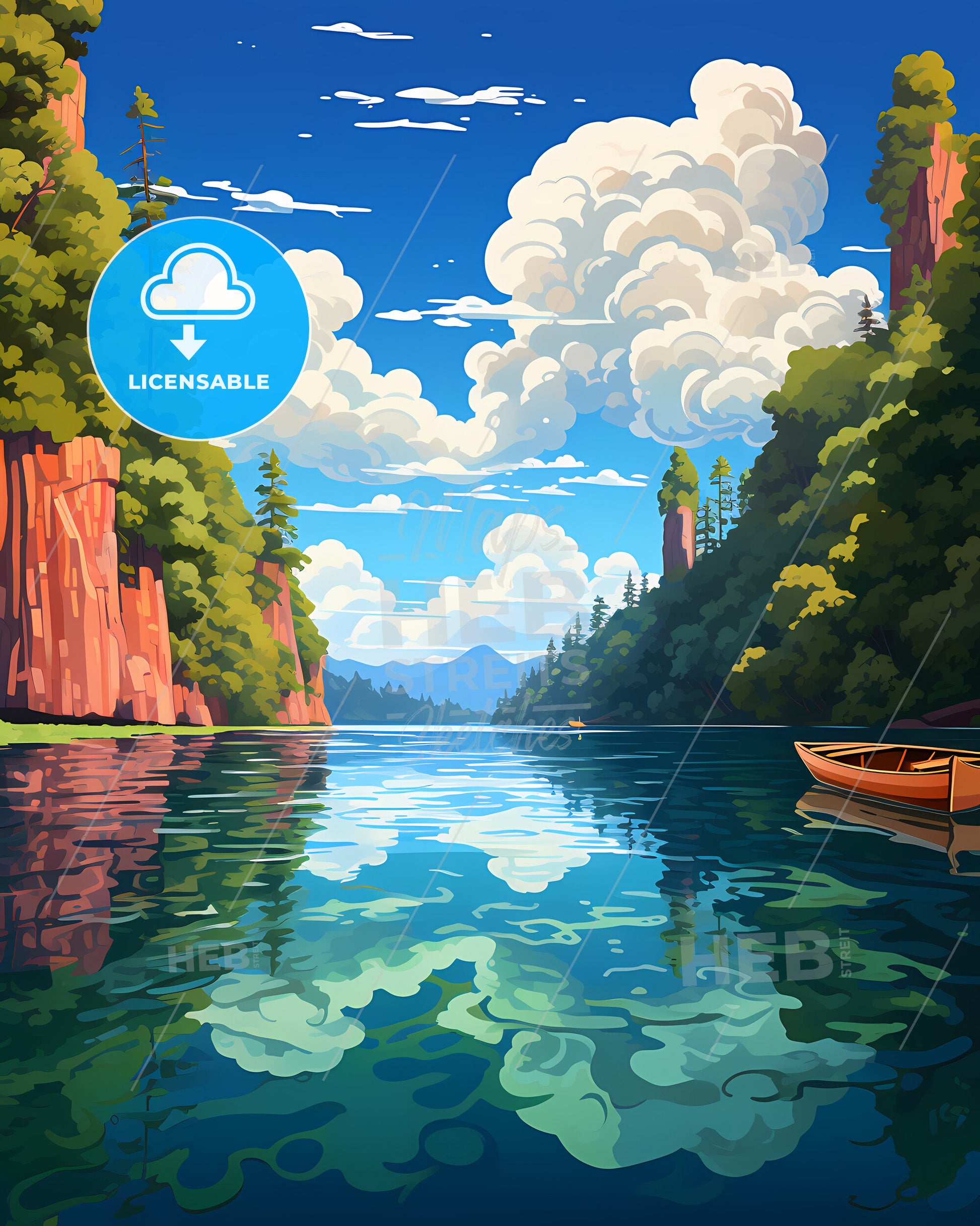 Raja Ampat, Indonesia. landscape, Watercolor Painting, oil Painting, Colorful Art Painting, oil painting like paper art, travel art sunny day, in the style of pink and crimson, Beautiful white Cloud, Blue Sky Painting, dark Orange and retro Red, dark turquoise and yellow, minimal shading, panoramic View