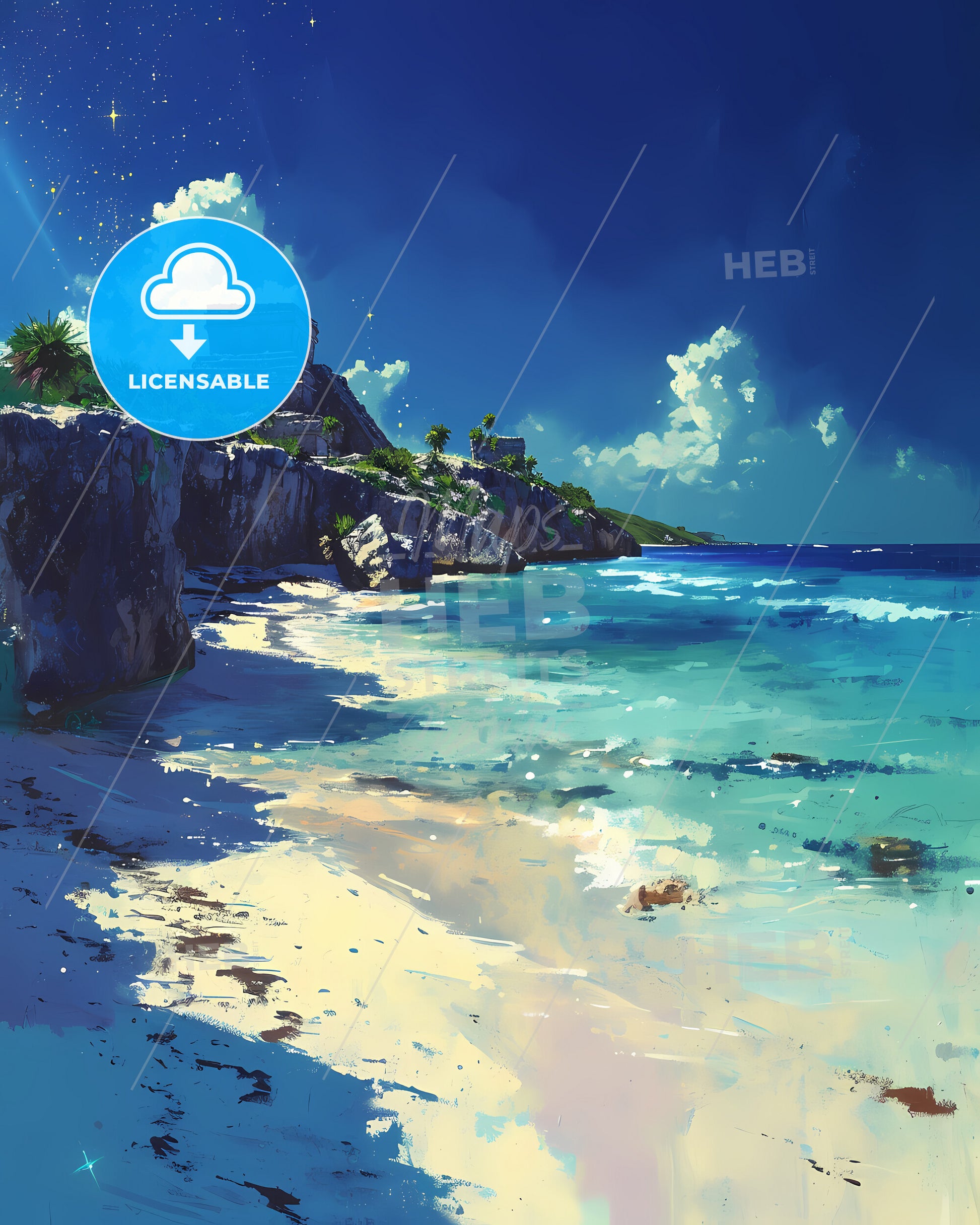 Tulum Beach, Mexico. Tulum Beach boasts white sands, clear waters, and the backdrop of ancient Mayan ruins. Art painting with deep blue sky. Only some bright higher clouds in the distance. Style of classic travel advertising illustration with nice gradients. Nice strokes and outlines. Large area of copy space on top. litte bright sparkles.