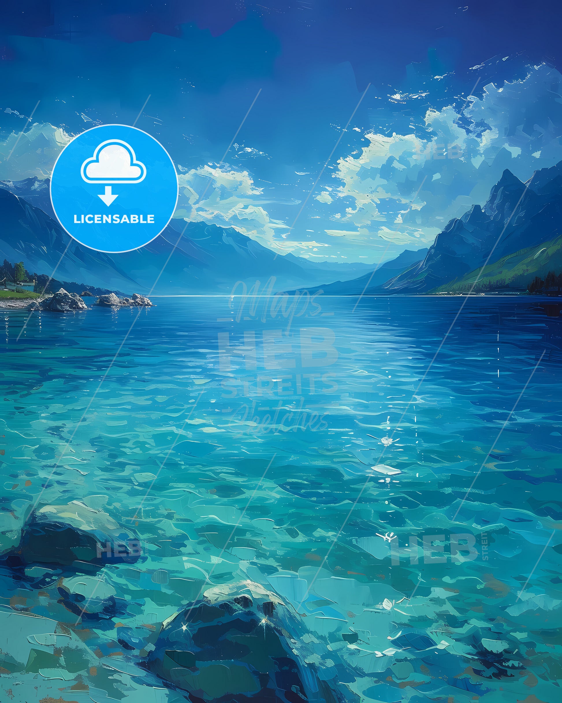 Lake Tahoe, USA. A large, clear freshwater lake nestled in the Sierra Nevada mountains. Art painting with deep blue sky an a focus on the turquoise clear water. Only some bright higher clouds in the distance. Style of impressionistic colorful painting made with acrylic colors, nice strokes and outlines. Large area of copy space on top. Some litte bright sparkles.