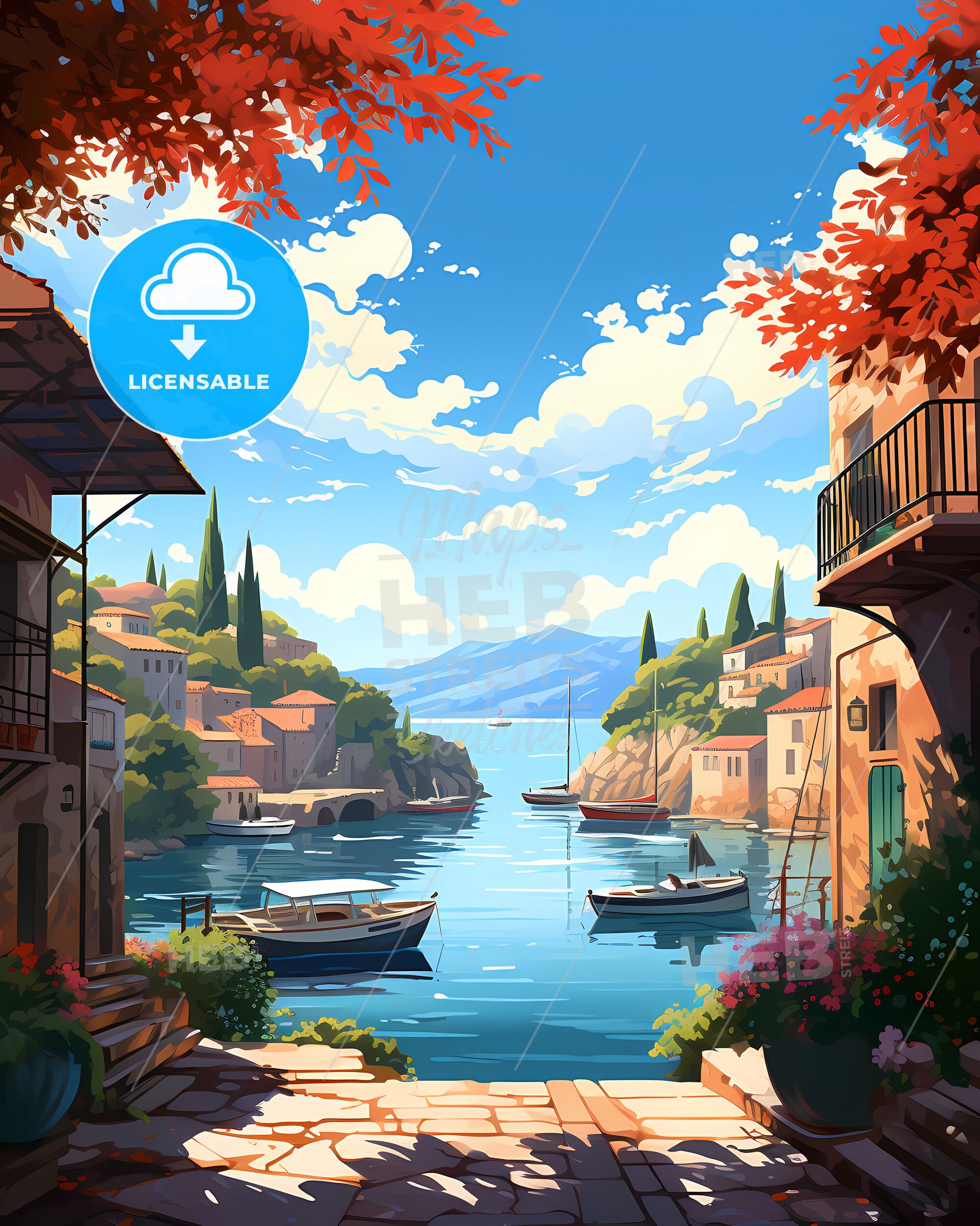 Hvar & The Pakleni Islands, Croatia. landscape, Watercolor Painting, oil Painting, Colorful Art Painting, oil painting like paper art, travel art sunny day, in the style of pink and crimson, Beautiful white Cloud, Blue Sky Painting, dark Orange and retro Red, dark turquoise and yellow, minimal shading, panoramic View