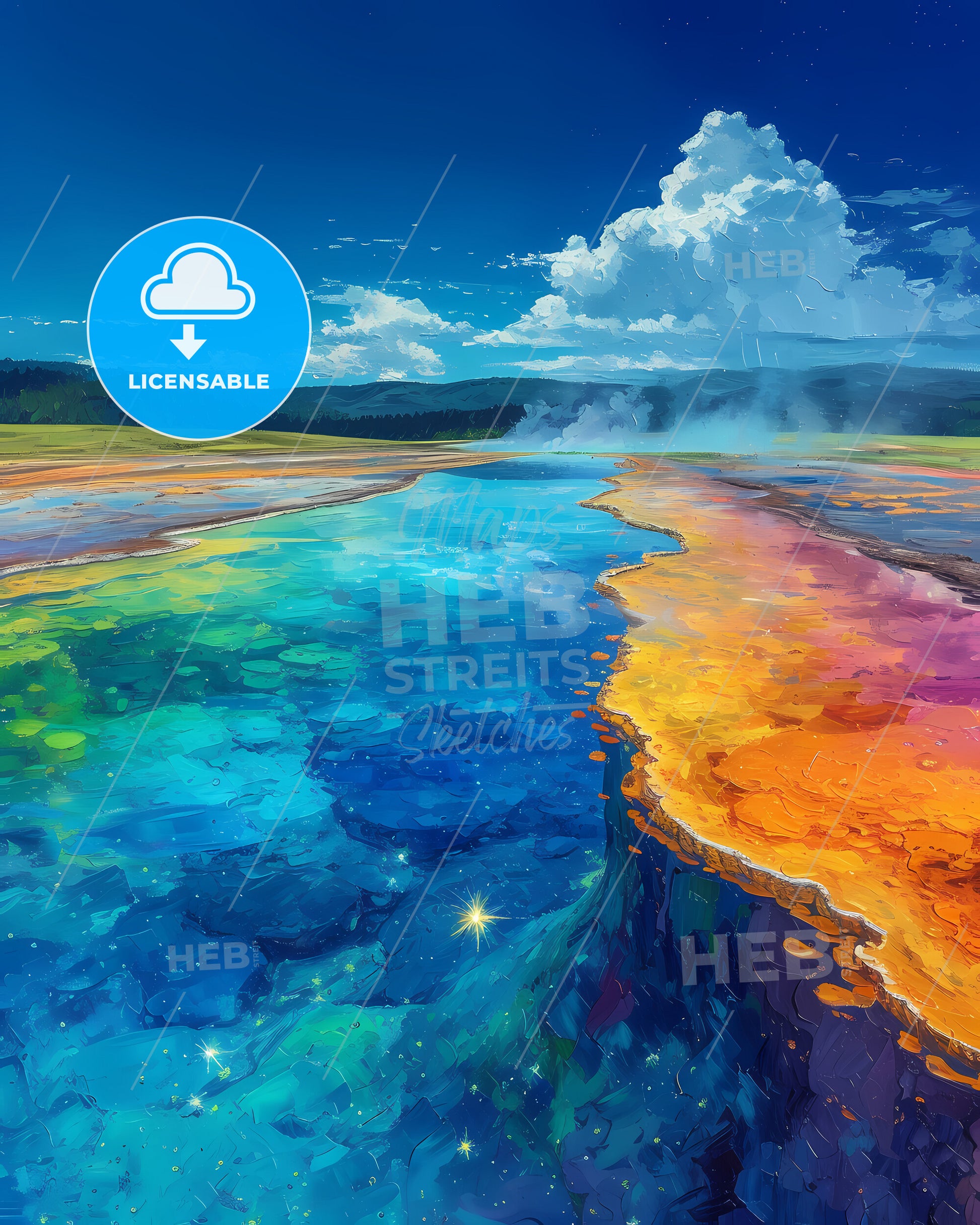Wai-O-Tapu, New Zealand. A geothermal area with vibrant-colored hot springs and bubbling mud pools. Art painting with deep blue sky an a focus on the turquoise clear water. Only some bright higher clouds in the distance. Style of impressionistic colorful painting made with acrylic colors, nice strokes and outlines. Large area of copy space on top. Some litte bright sparkles.