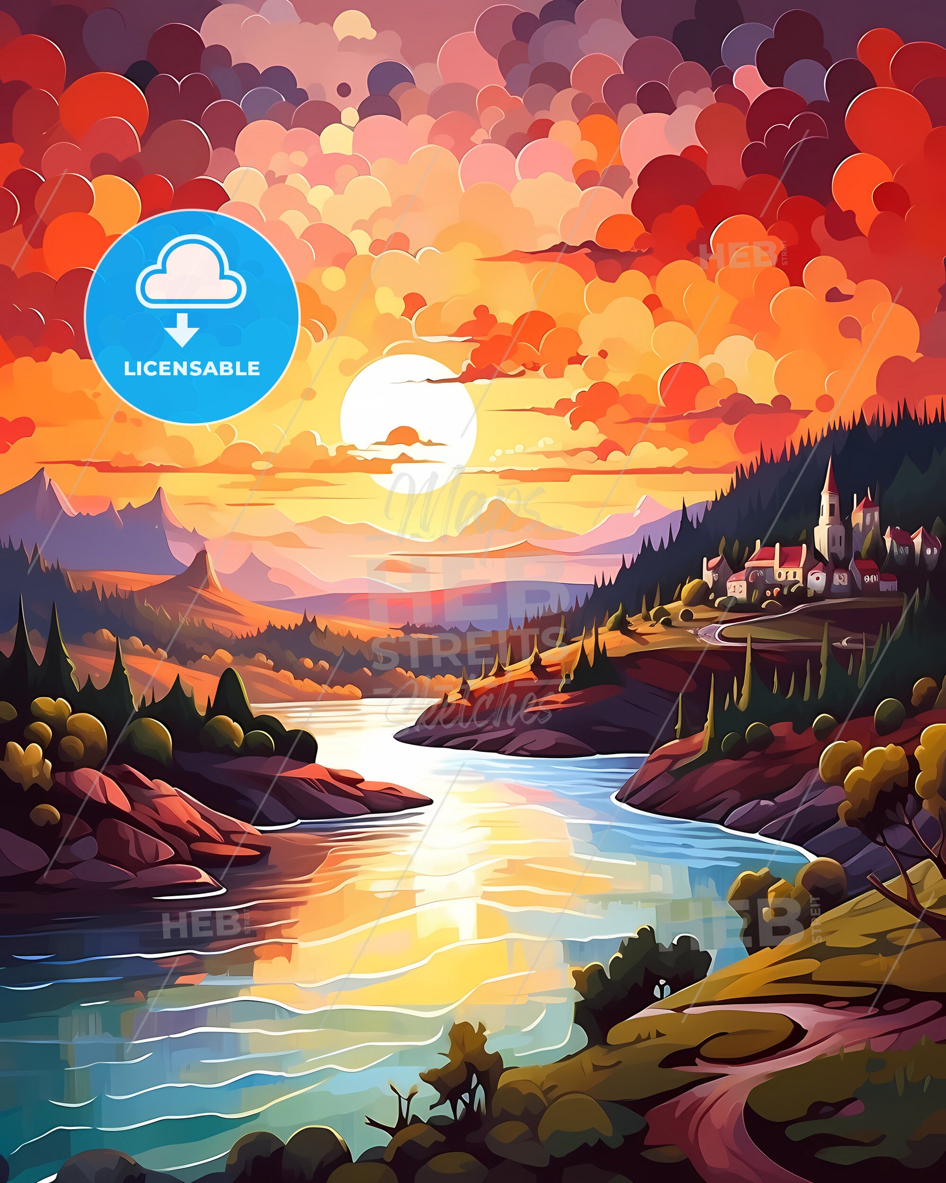 Reunion, France. landscape, Watercolor Painting, oil Painting, Colorful Art Painting, oil painting like paper art, travel art sunny day, in the style of pink and crimson, Beautiful white Cloud, Blue Sky Painting, dark Orange and retro Red, dark turquoise and yellow, minimal shading, panoramic View